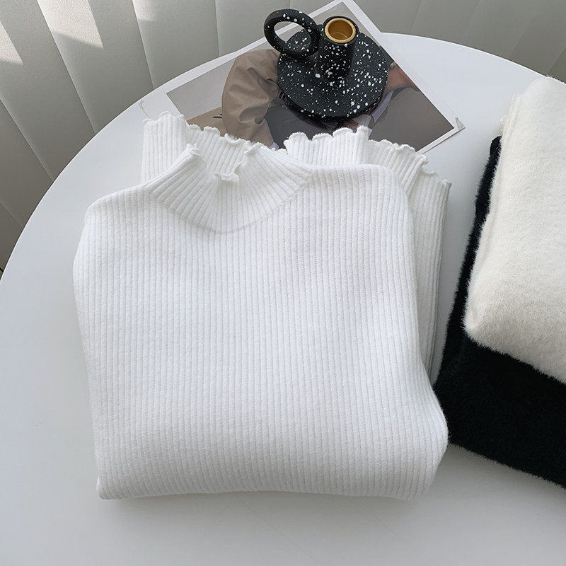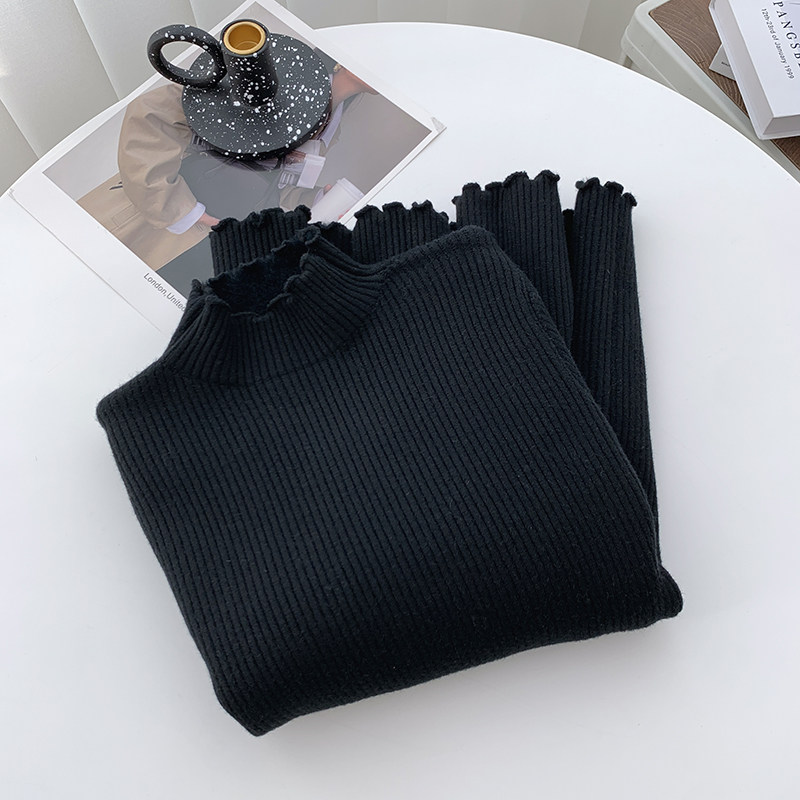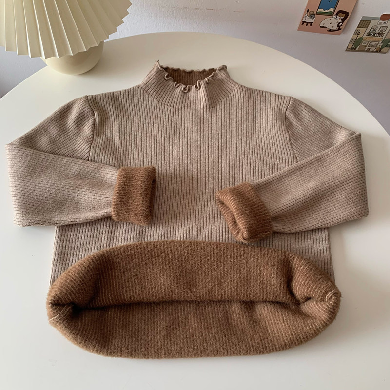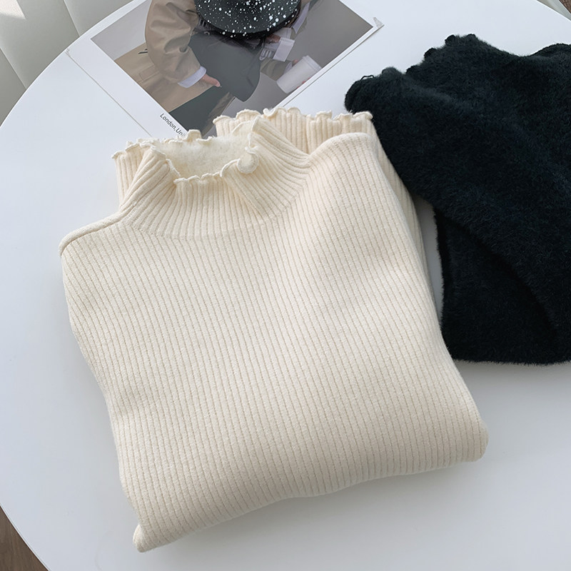 灰色毛衣女秋冬季木耳边半高领加厚一体绒保暖长袖打底针织衫上衣