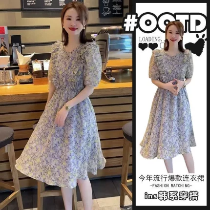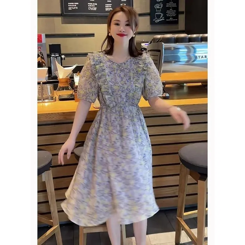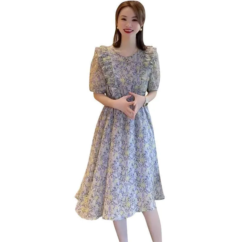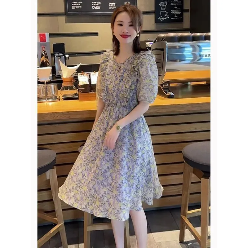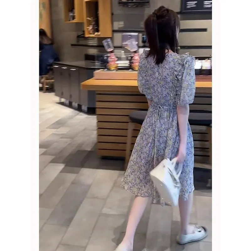 法式桔梗茶歇裙小清新碎花连衣裙子女夏季荷叶边收腰显瘦a字长裙