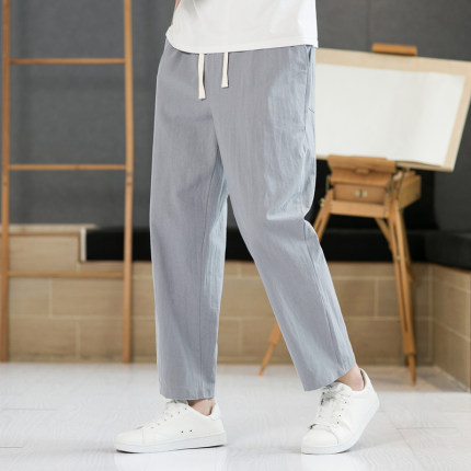 棉麻纯棉休闲裤男士夏季薄款潮流百搭宽松直筒弹力松紧腰九分裤子