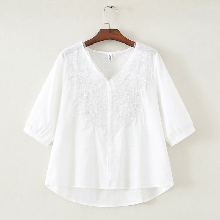 棉麻V领七分袖衬衫女夏季新款刺绣薄款上衣纯色T恤小衫宽松2023