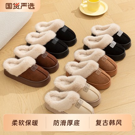 轻臣2025新款翻半包跟棉拖加绒保暖情侣外穿毛毛绒厚底黑色复古