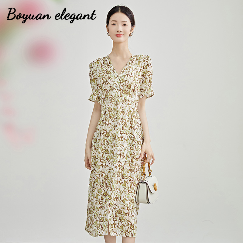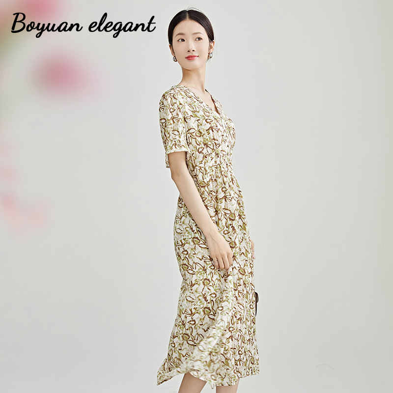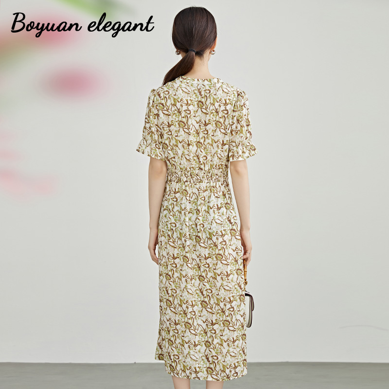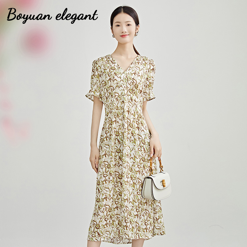柏媛绿咖色高级感碎花连衣裙女2025复古撞色印花荷叶袖雪纺长裙子