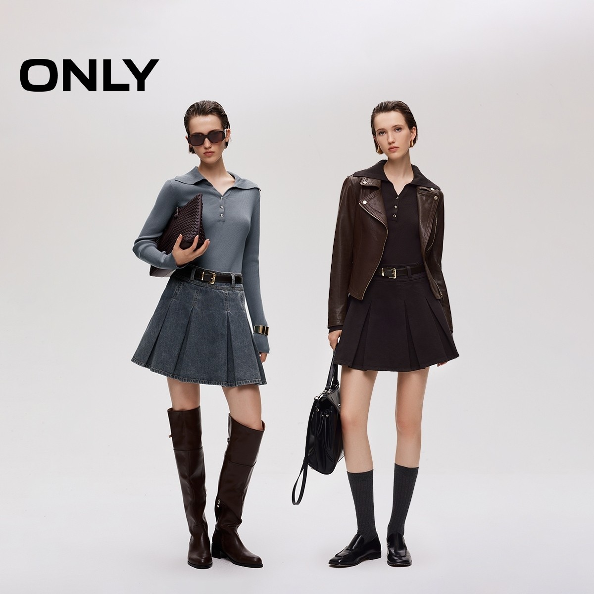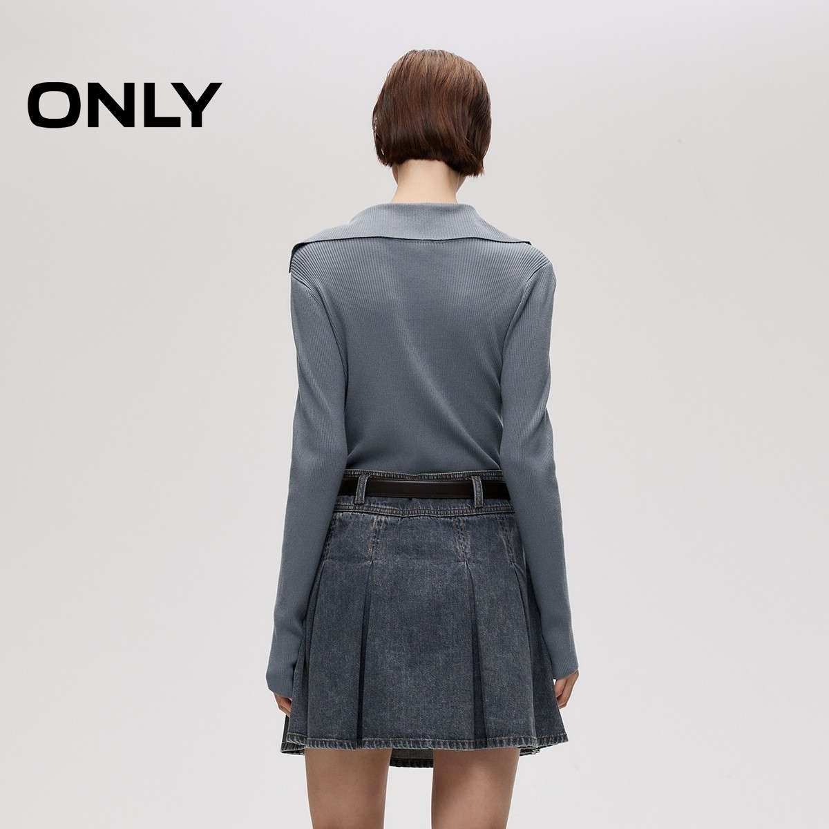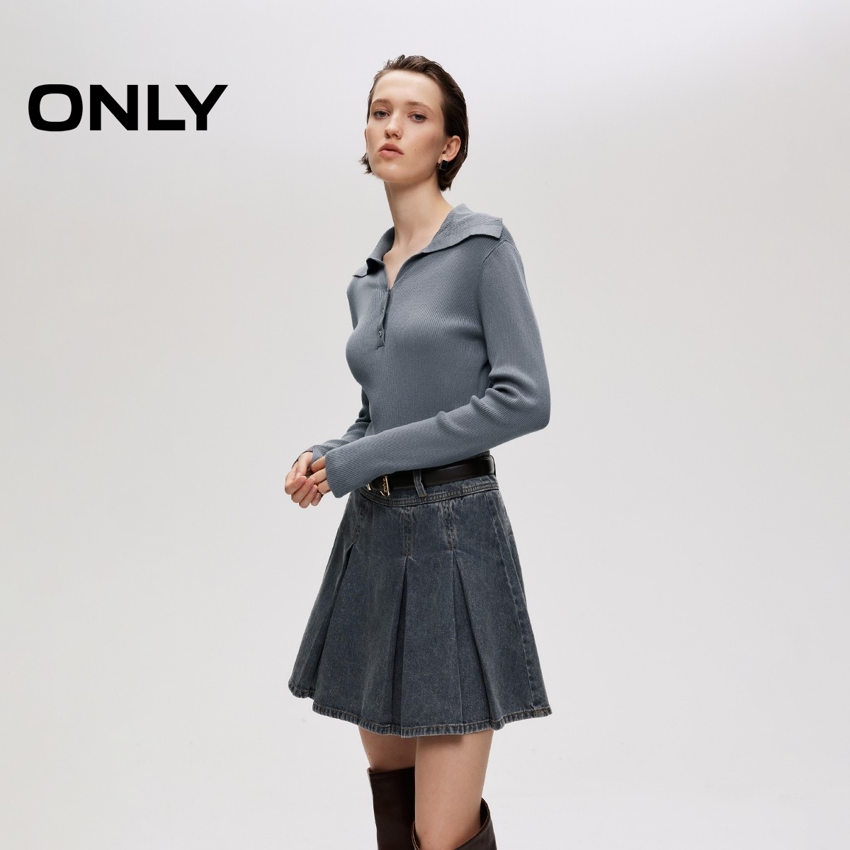 ONLY2025秋季新款时髦针织拼接假两件A字百褶牛仔短裙连衣裙女