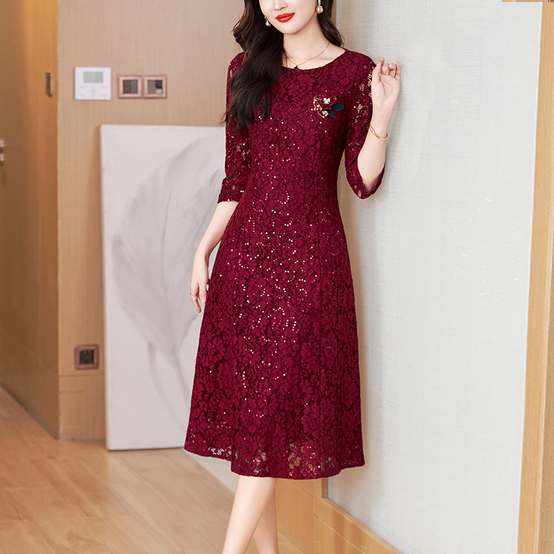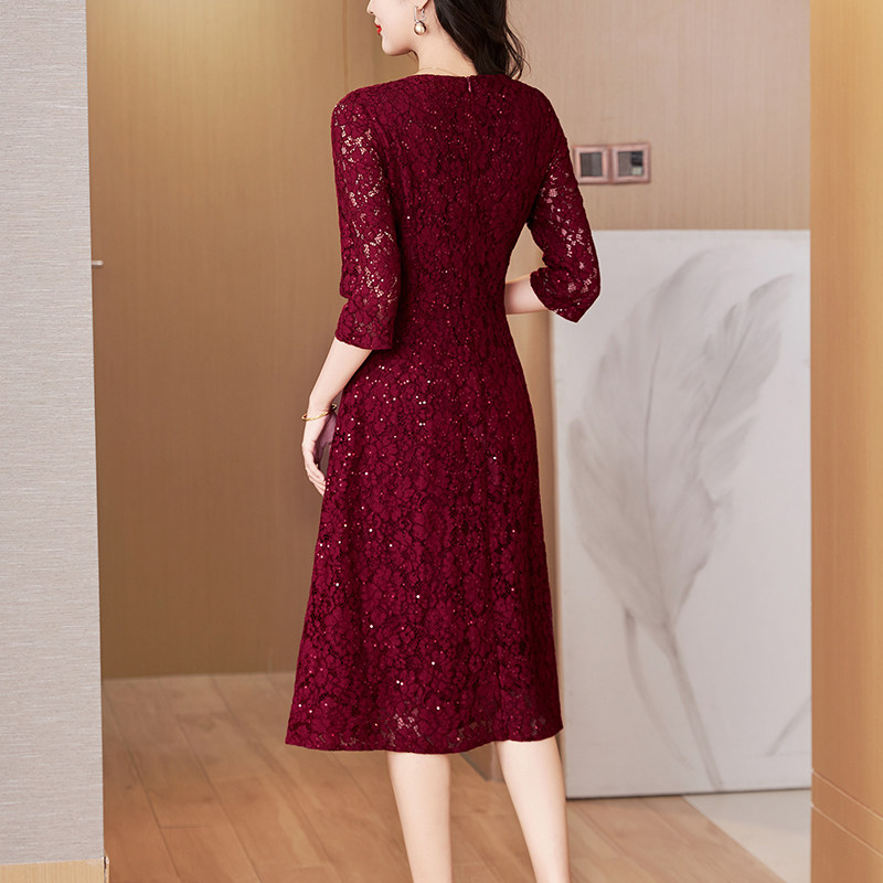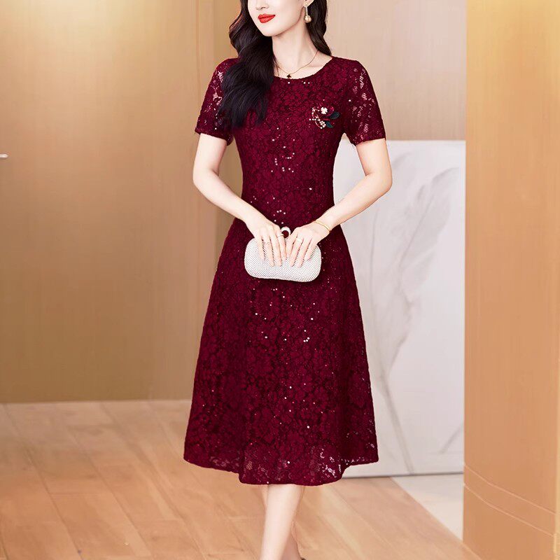 酒红色中国风妈妈礼服2025年夏季新款高端蕾丝收腰显瘦包臀连衣裙