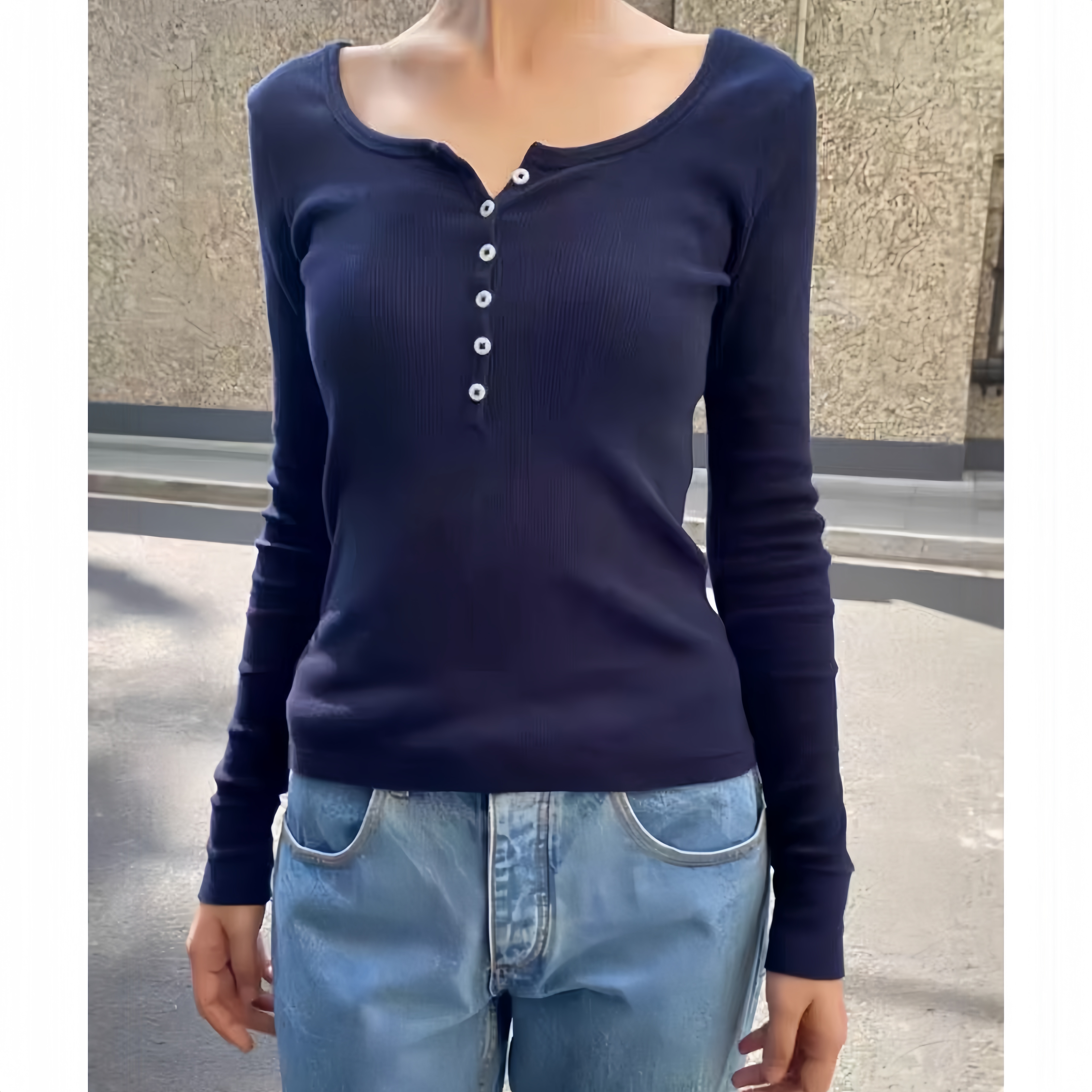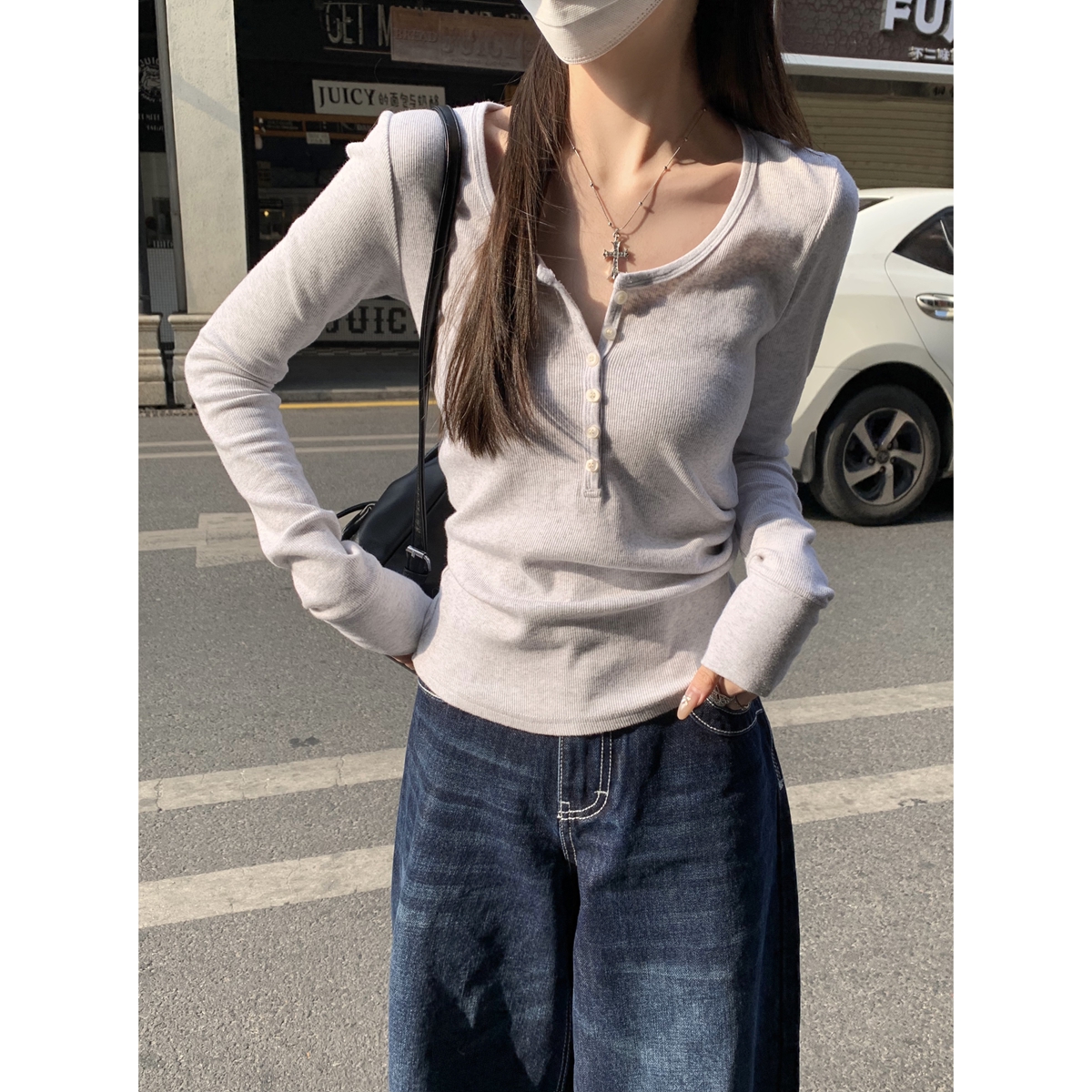 简约纯色六粒扣长袖T恤上衣女百搭修身纯棉打底衫显瘦秋冬内搭潮