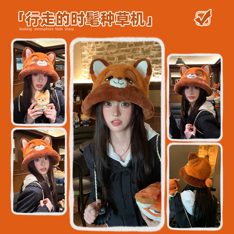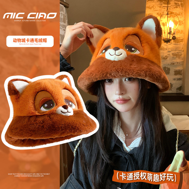 迪士尼火狐狸尼克帽子女渔夫帽2025新款秋冬季保暖毛绒盆帽显脸小