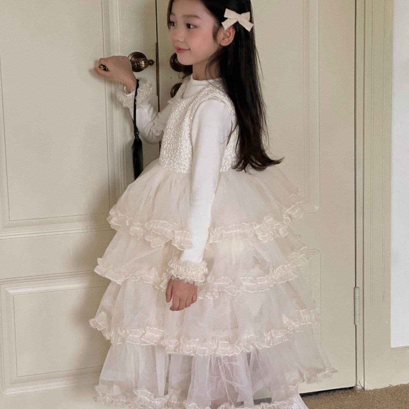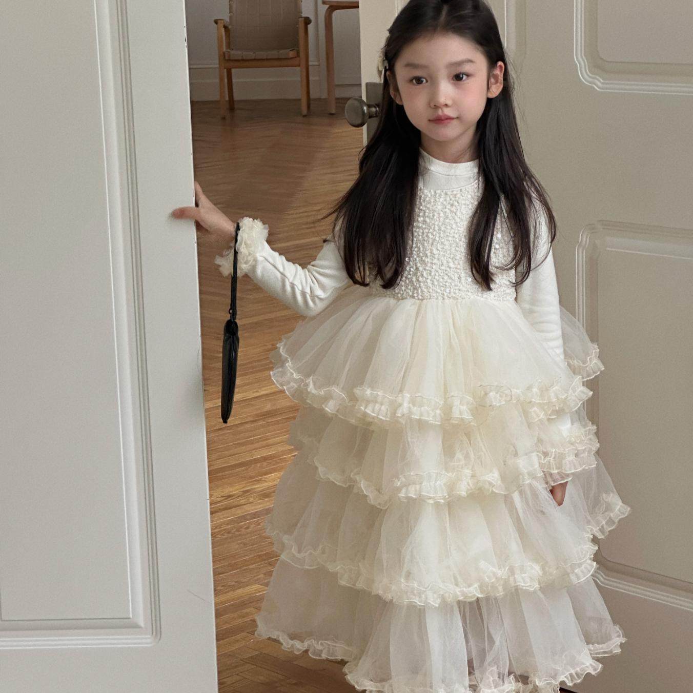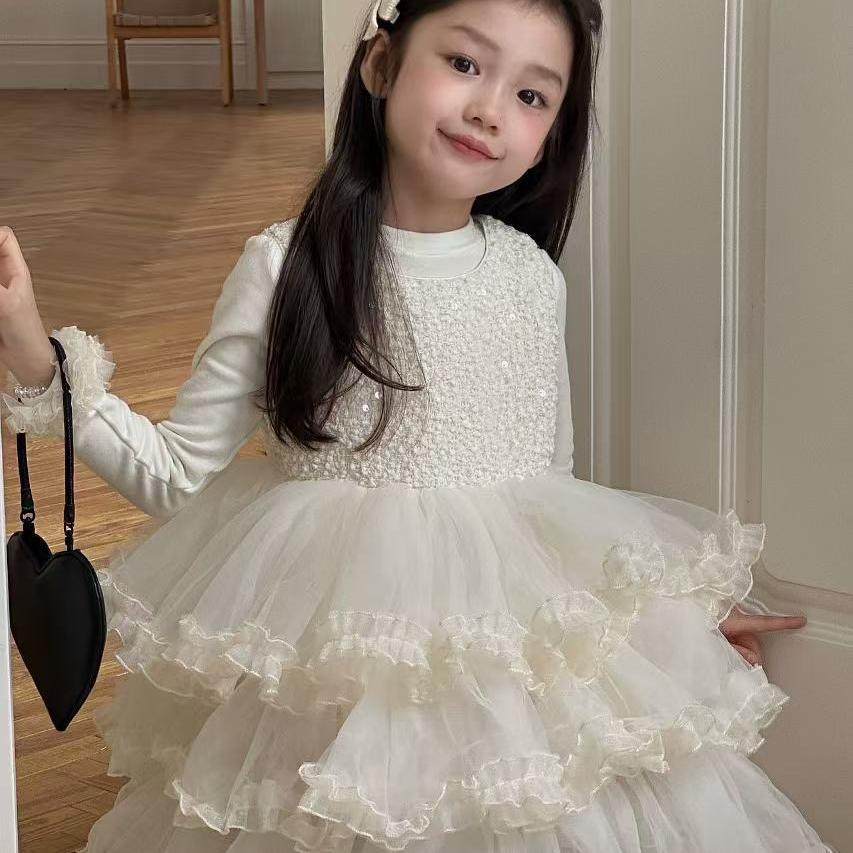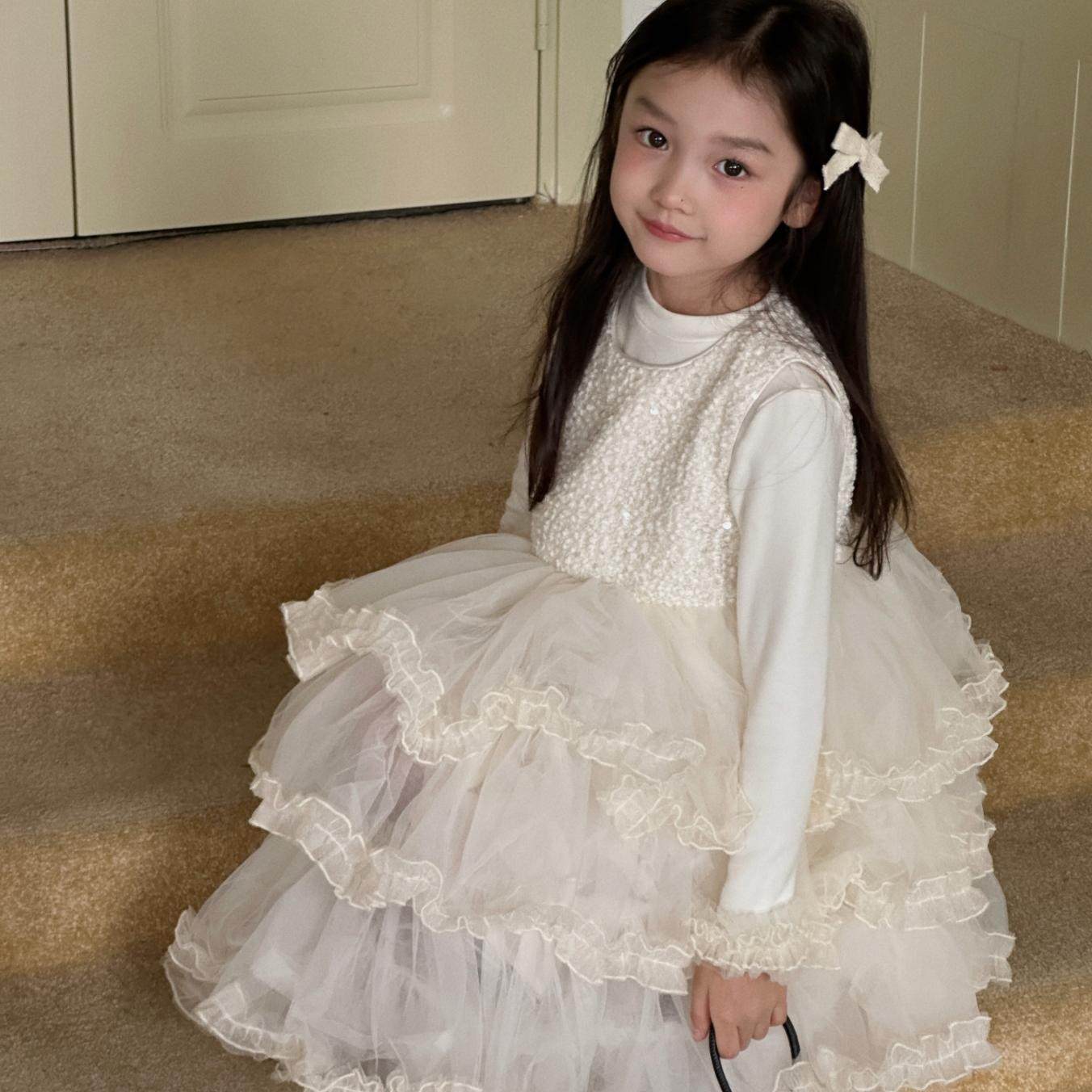 奶油白女童生日礼服裙精致亮片背心裙拼接蛋糕裙花童蓬蓬纱公主裙