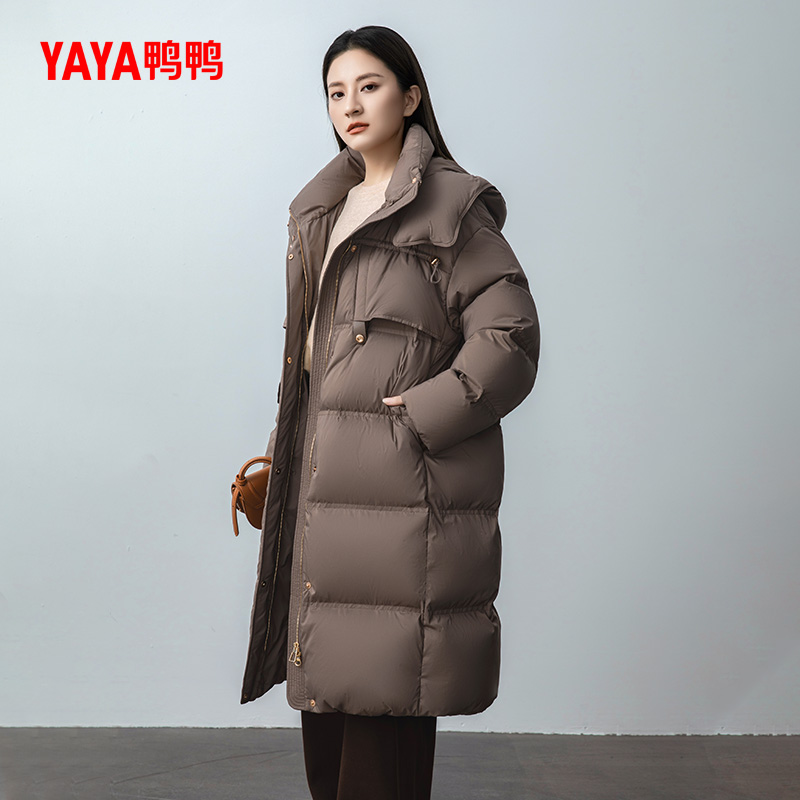鸭鸭美拉德风羽绒服女士2025冬季新品过膝中长款连帽气质鸭绒外套