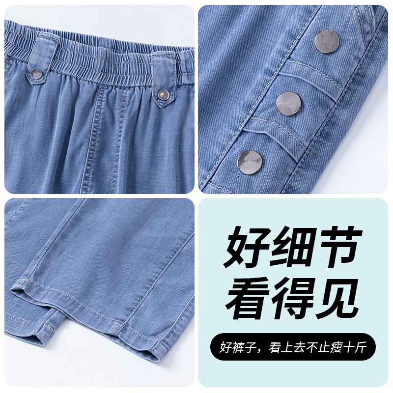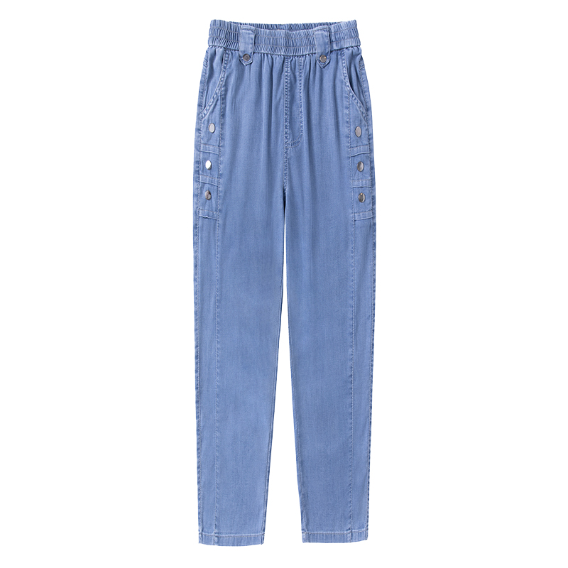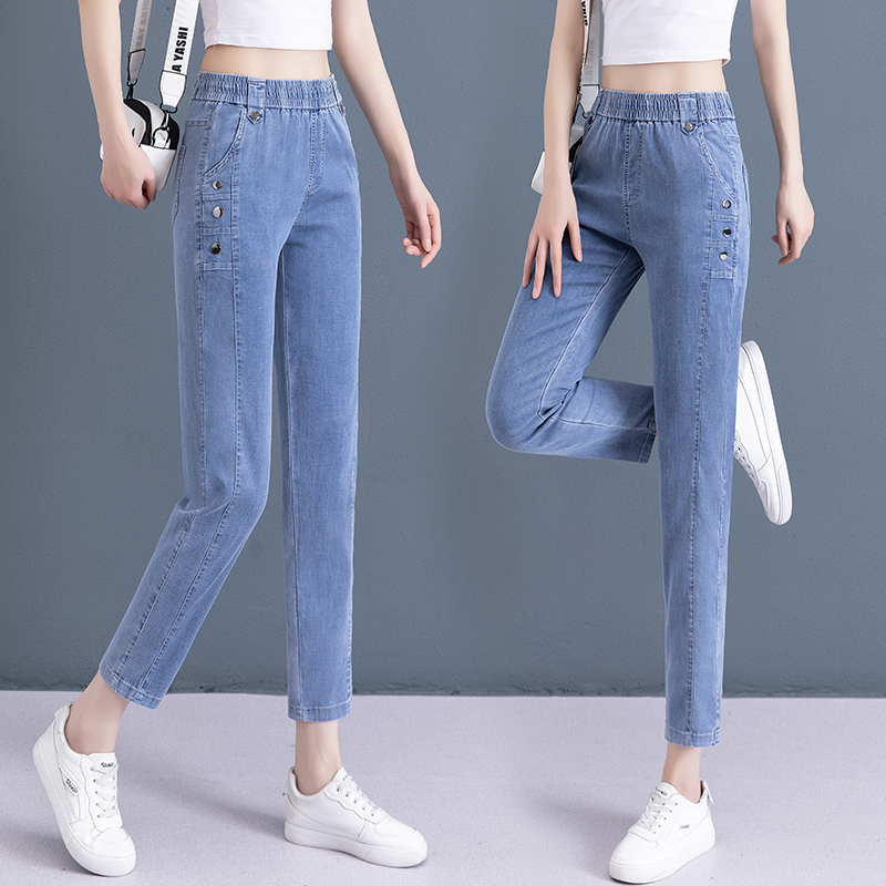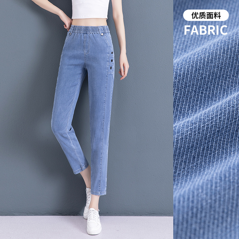 松紧腰天丝牛仔裤女款高腰显瘦夏季薄款哈伦裤柔软轻薄透气九分裤