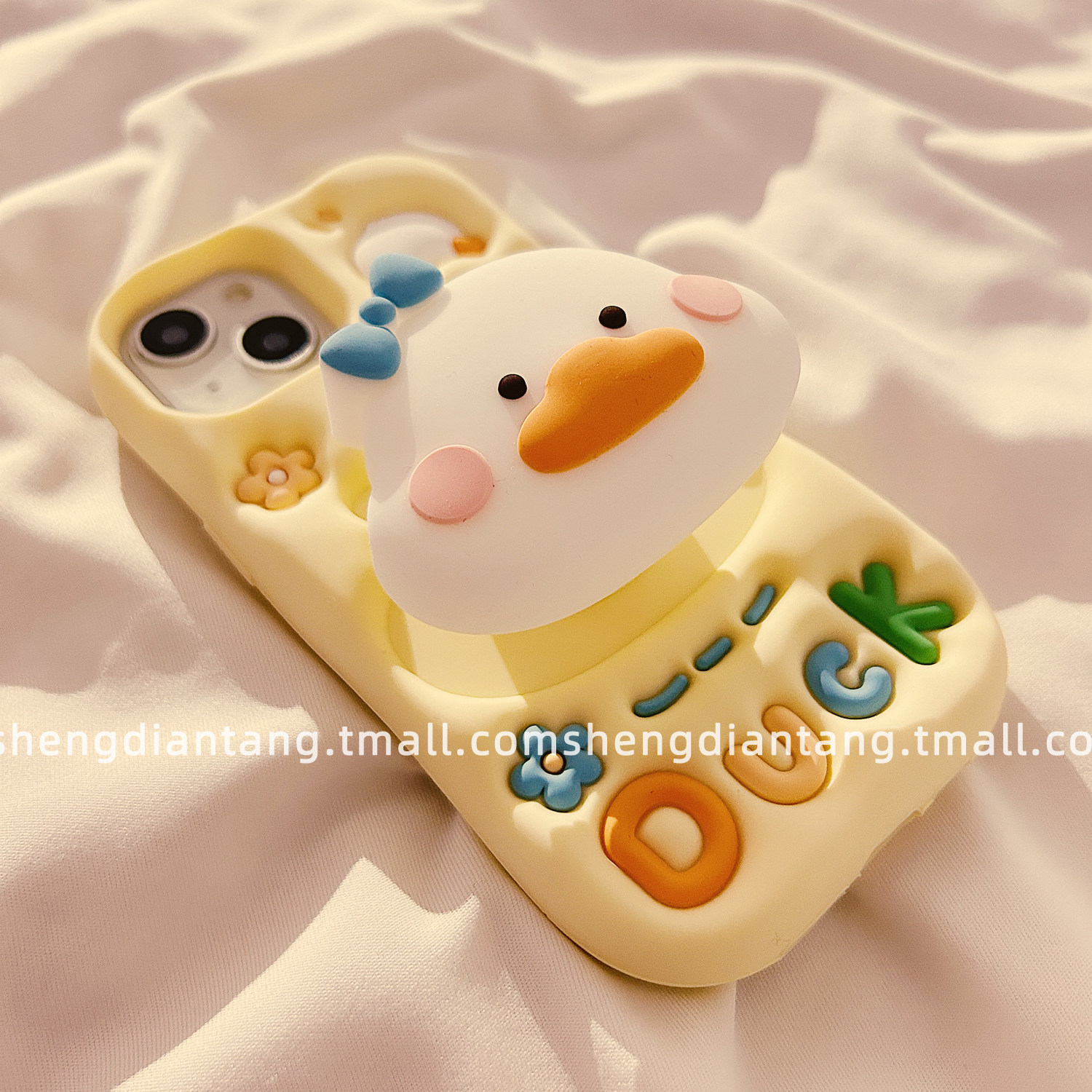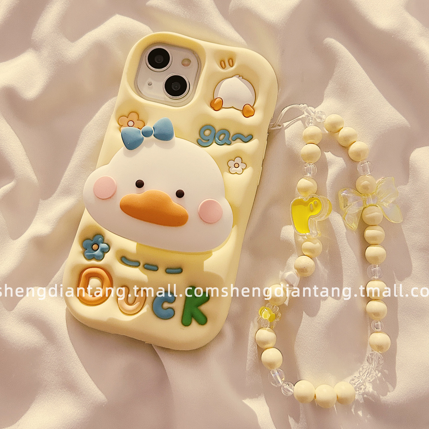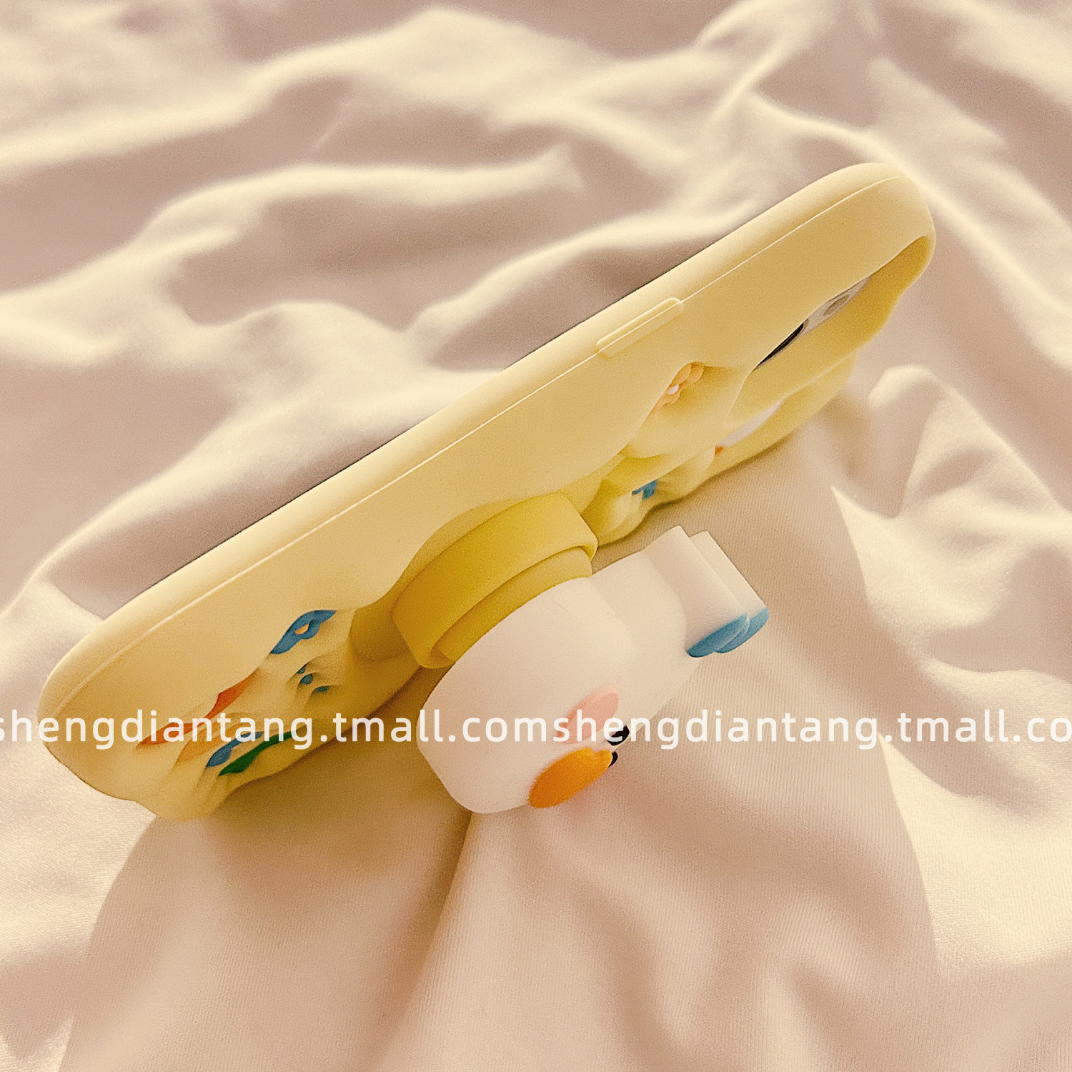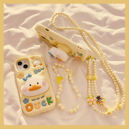 夏日奶黄花朵鸭子支架适用苹果15ProMax手机壳iphone15新款14可爱13立体卡通12女款16promax软硅胶保护套链条