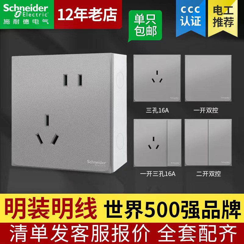 施耐德明装插座 三孔16A空调插座明线盒超薄墙壁五孔带一开关面板
