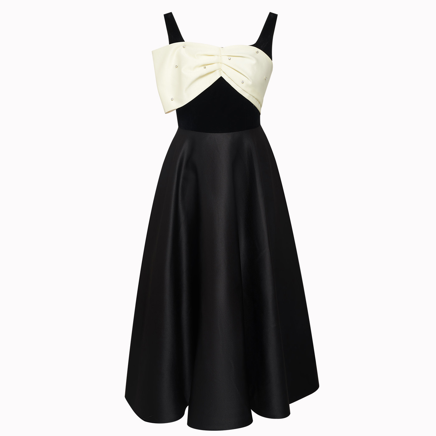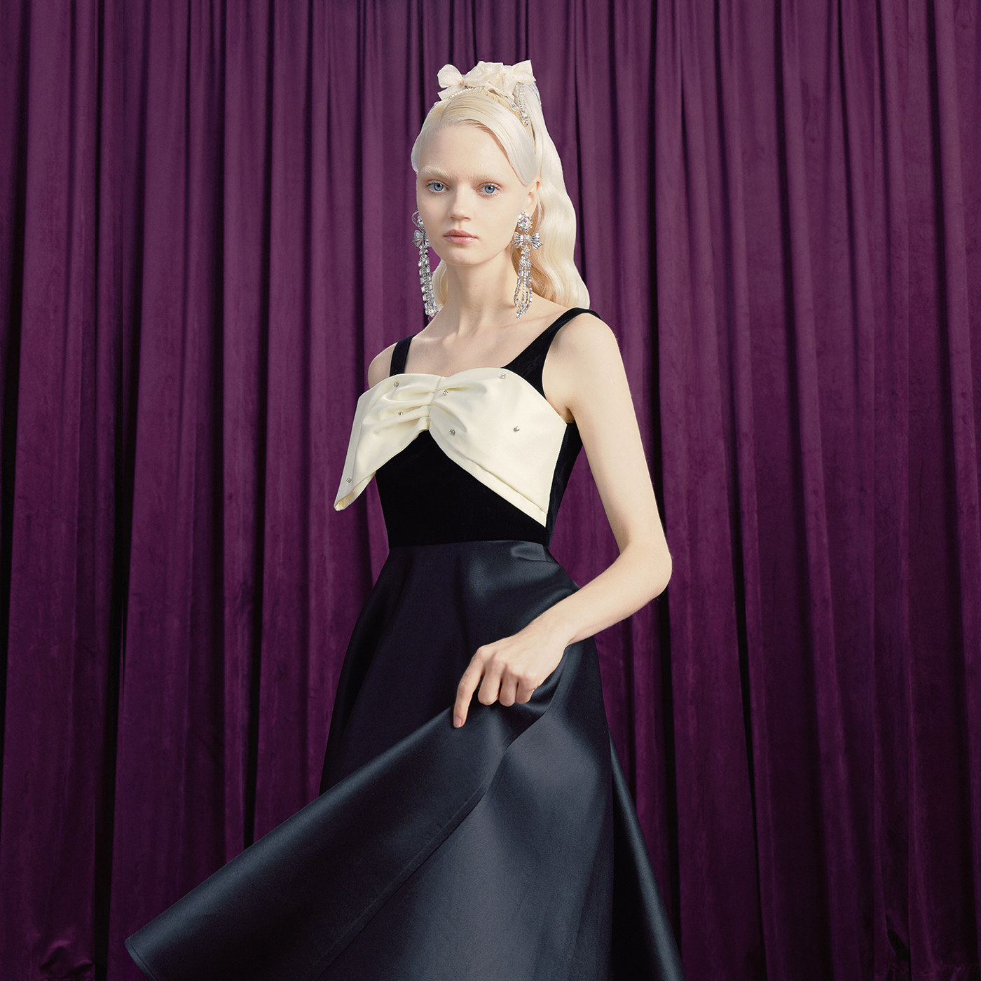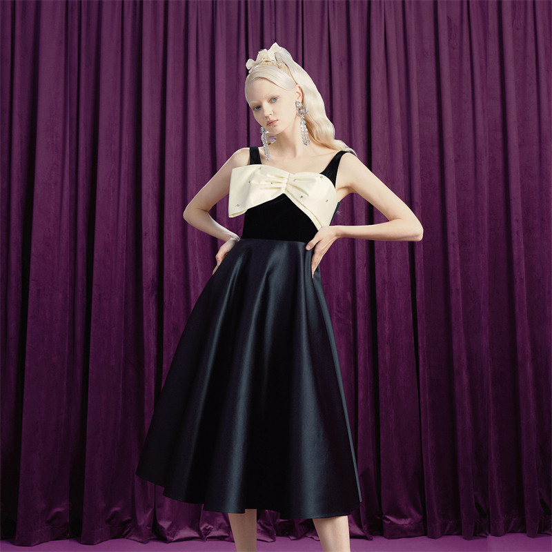【商场同款】糖力 高雅小礼服女 中长款撞色钻饰蝴蝶结吊带连衣裙