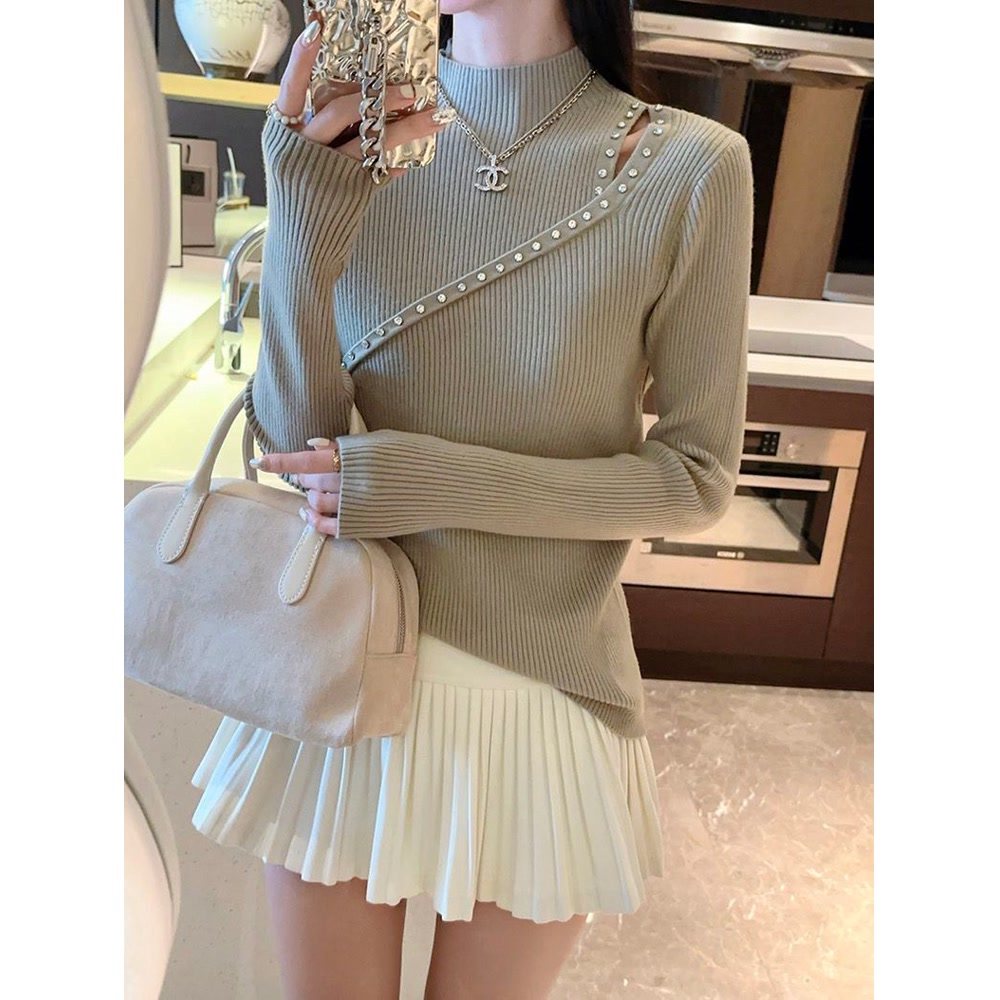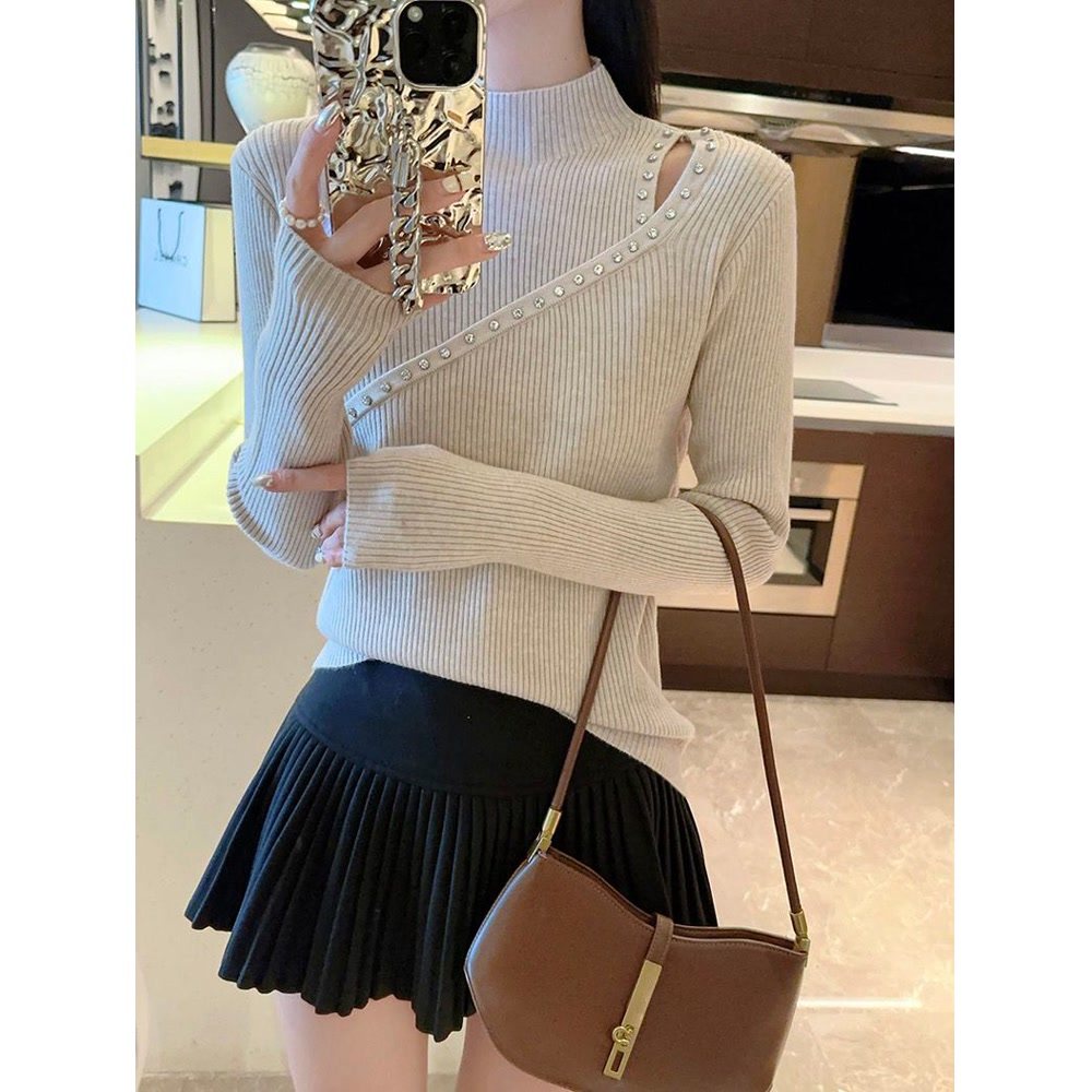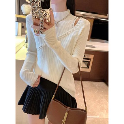 半高领打底衫新款女秋冬镂空钉珠毛衣修身高级感长袖打底上衣女装