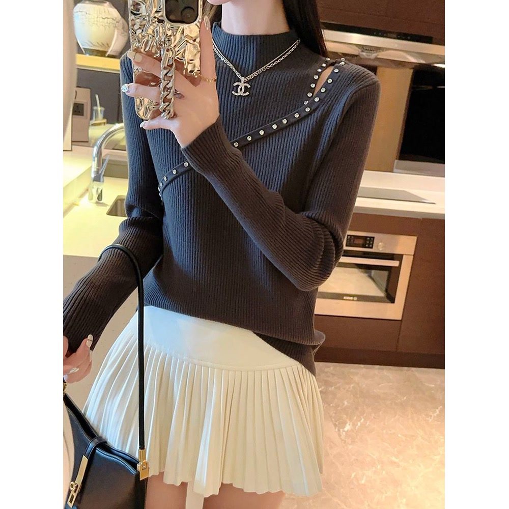 秋冬半高领镂空钉珠打底毛衣女