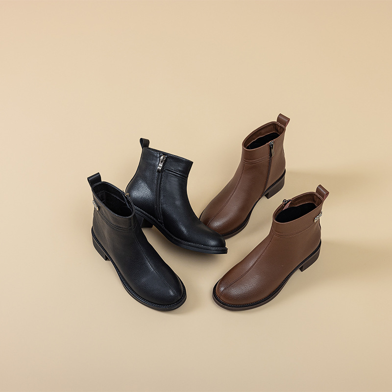 日本品质真皮棕色短靴女粗跟秋冬时尚马丁靴休闲复古裸靴百搭新款
