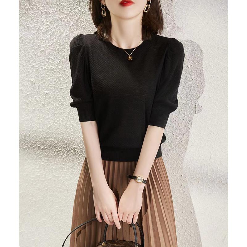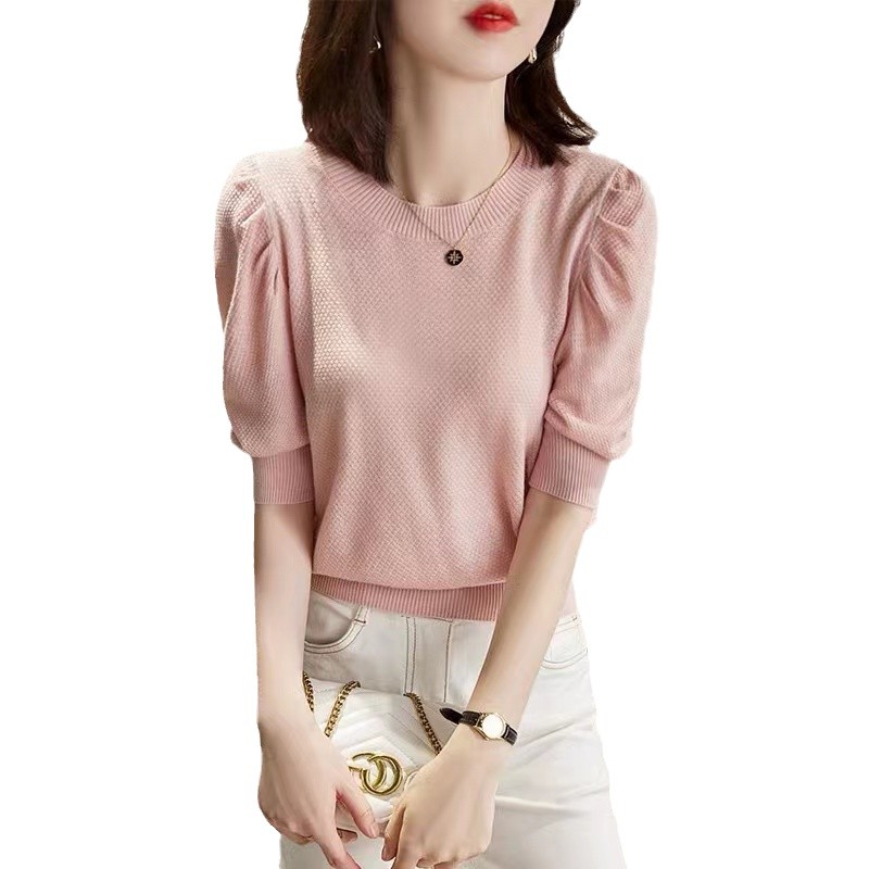 法式气质泡泡袖冰丝五分袖针织衫女夏季薄款短袖宽松短款半袖T恤
