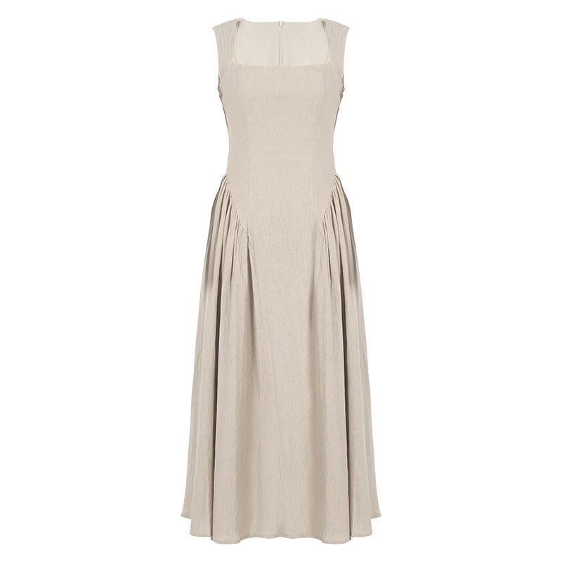 2025夏季新款女装法式方领收腰褶皱遮腹大摆无袖长款连衣裙9801