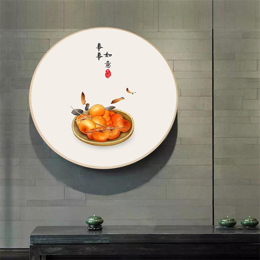 柿柿如意餐厅装饰画圆形新中式柿子画餐桌壁画原木风入户玄关挂画