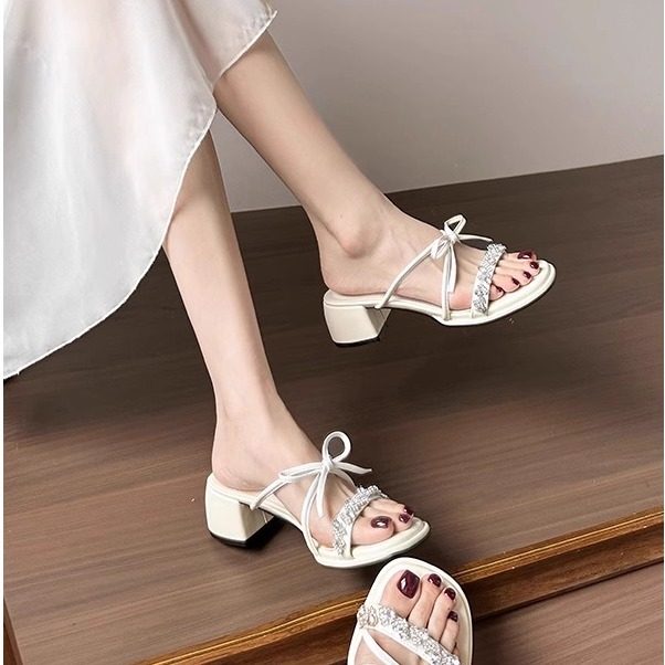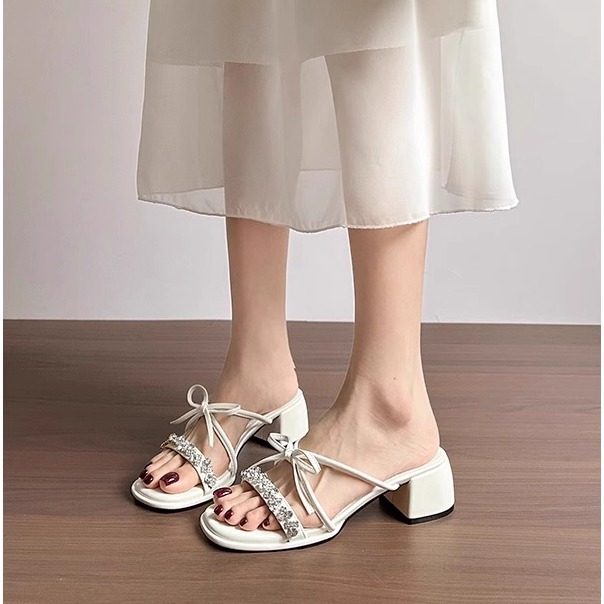 粗跟蝴蝶结水钻凉拖鞋2025夏新款