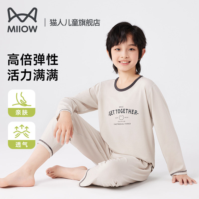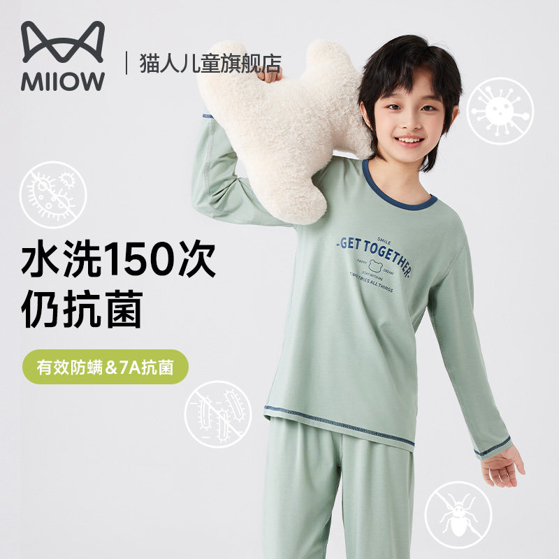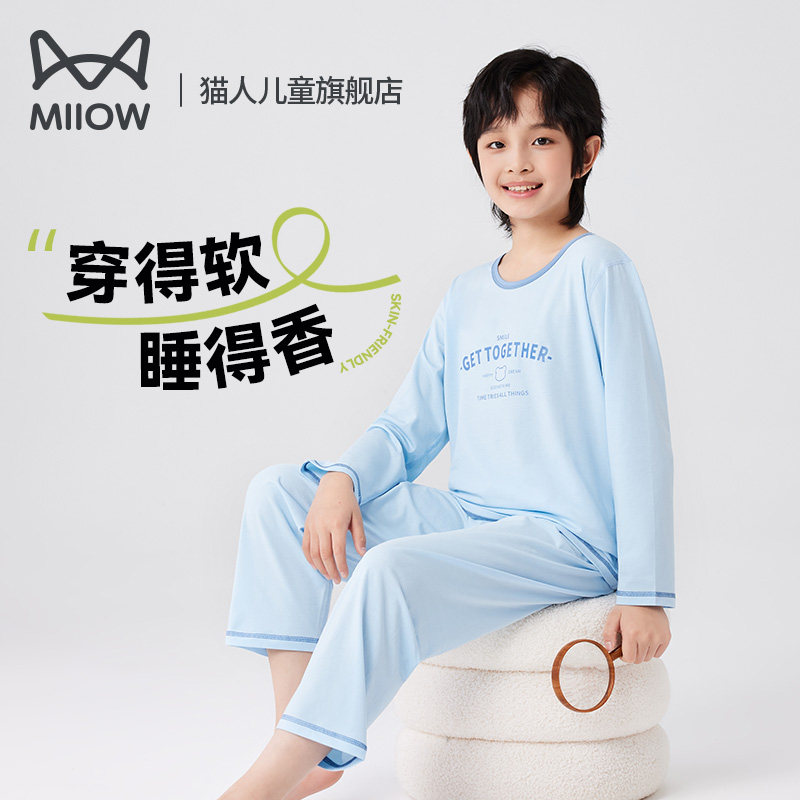 猫人儿童睡衣套装长袖薄款夏天男童莫代尔棉家居服中大童凉感抗菌