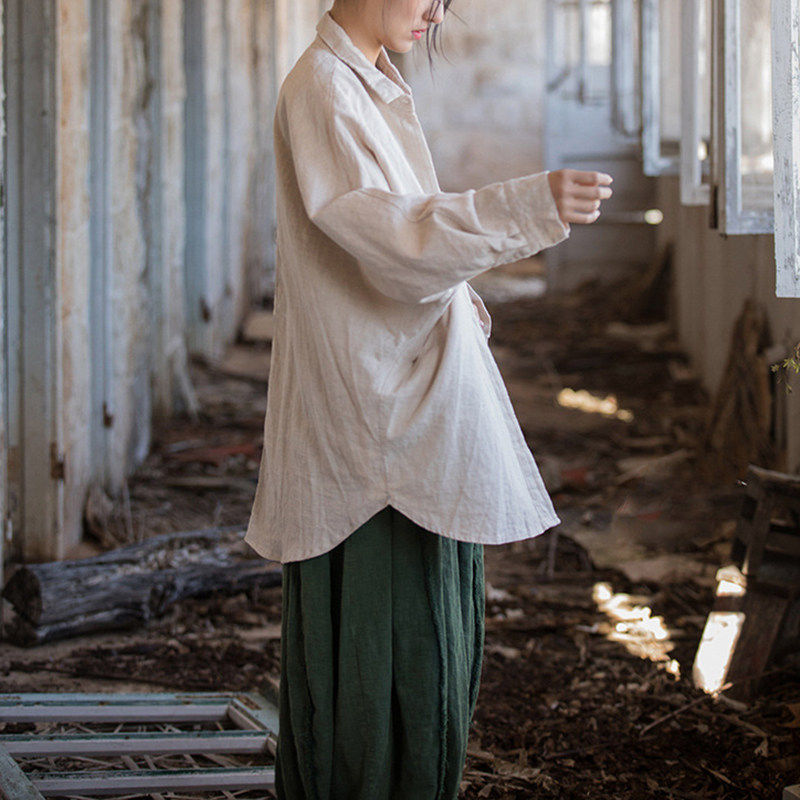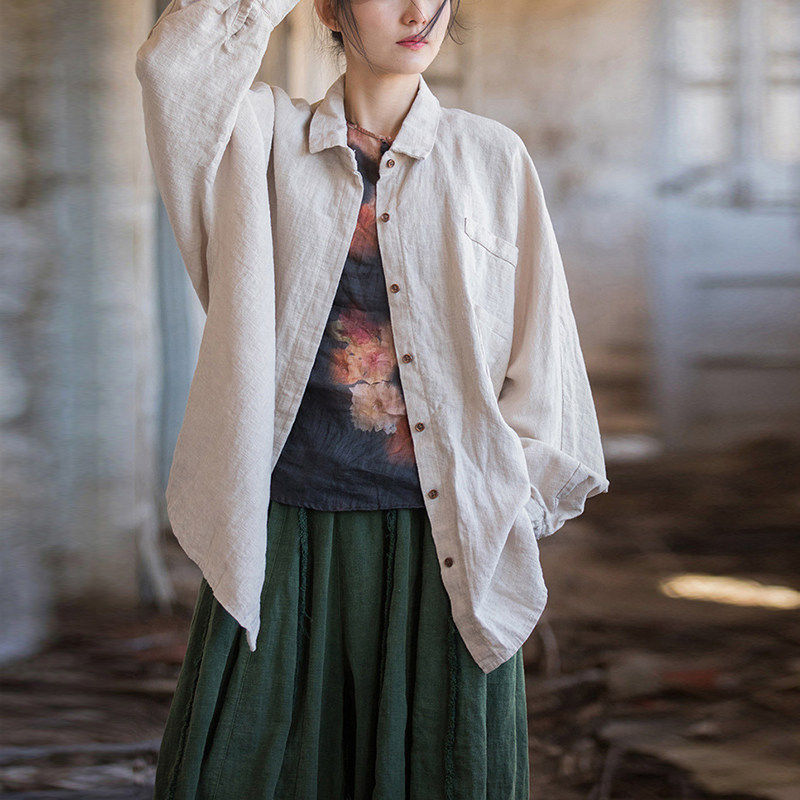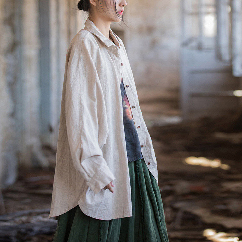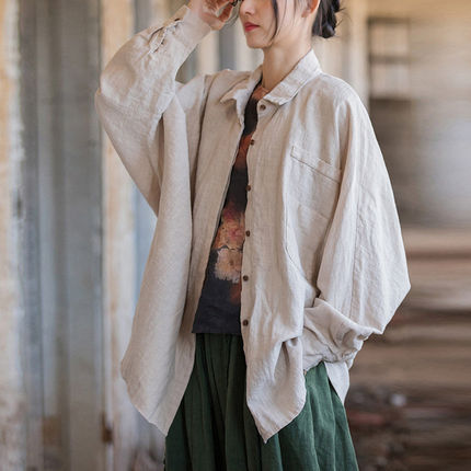 春夏新款翻领蝙蝠袖纯色苎麻棉砂洗女宽松衬衫休闲棉麻复古衬衣