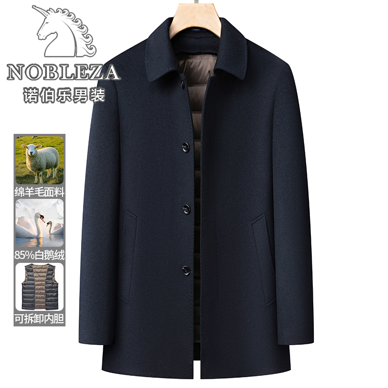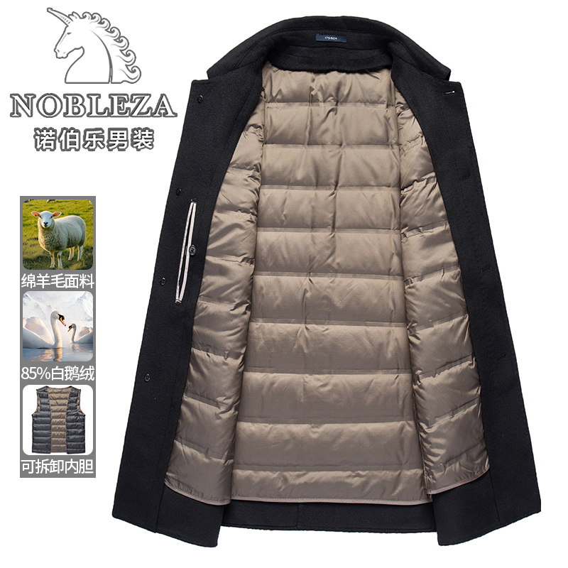 诺伯乐冬季羊毛大衣男双面呢白鹅绒内胆可拆卸毛呢中长款商务外套