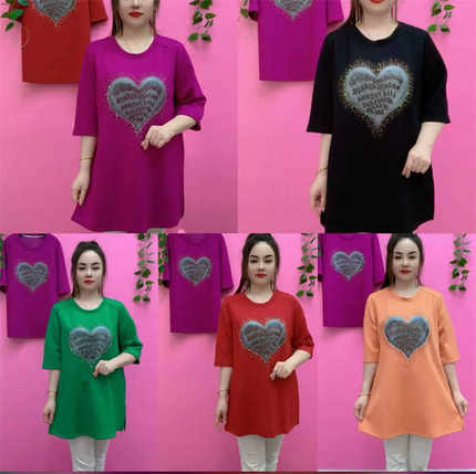 早秋新款时尚洋气减龄胖妹妹烫钻爱心圆领五分袖T恤大衫宽松遮肉