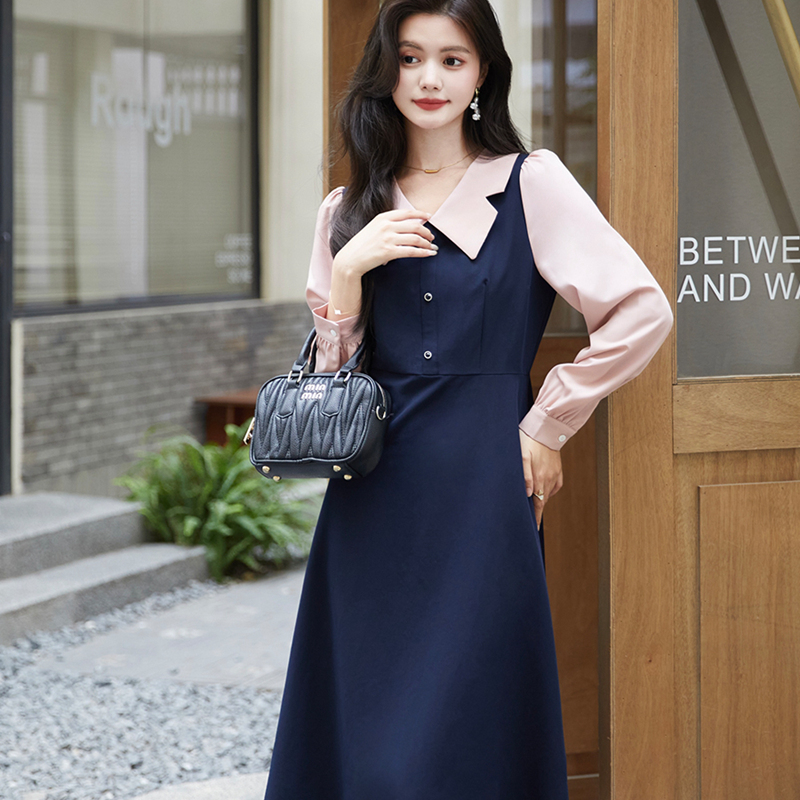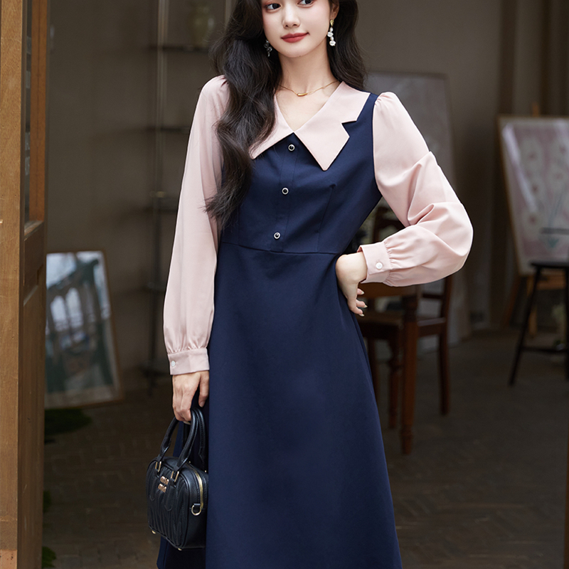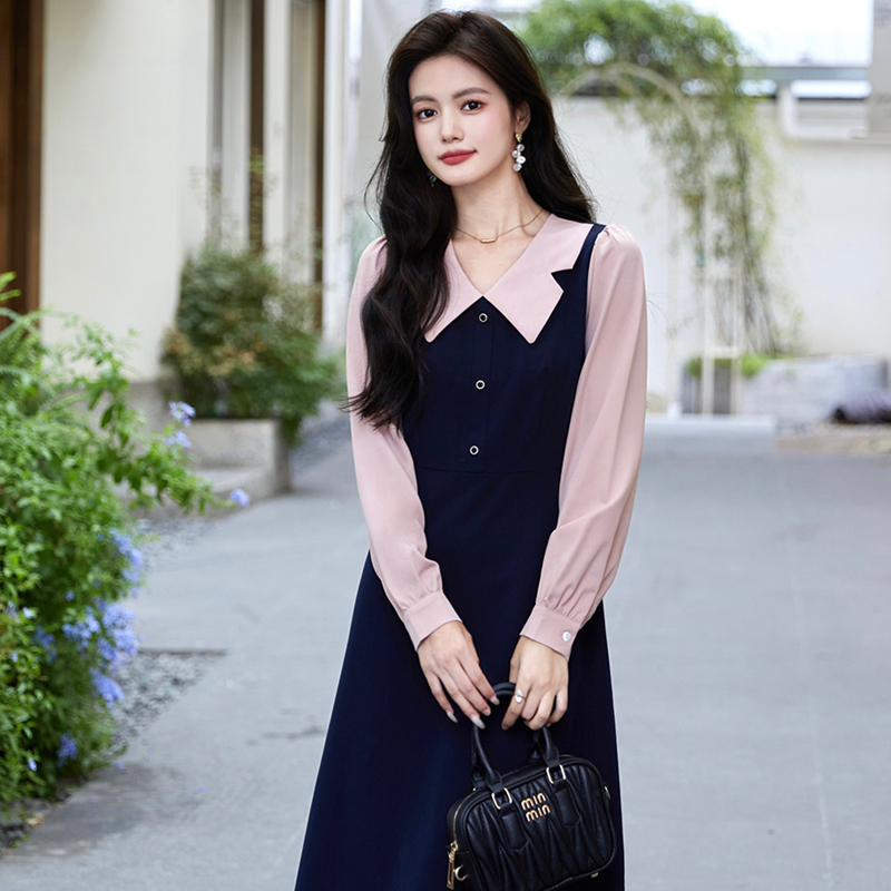 2025秋新款撞色假两件连衣裙女教资面试时尚复古气质收腰衬衫裙子