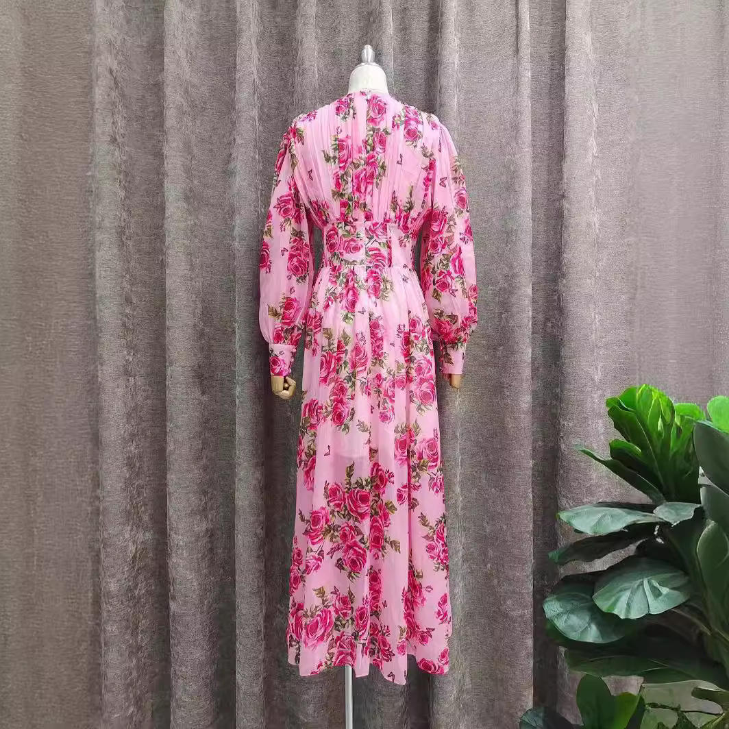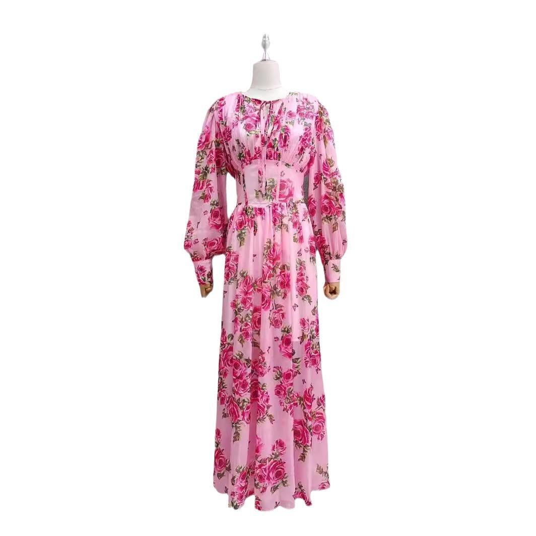 新款 春秋季时尚名媛气质灯笼长袖圆领收腰显瘦a字雪纺印花连衣裙