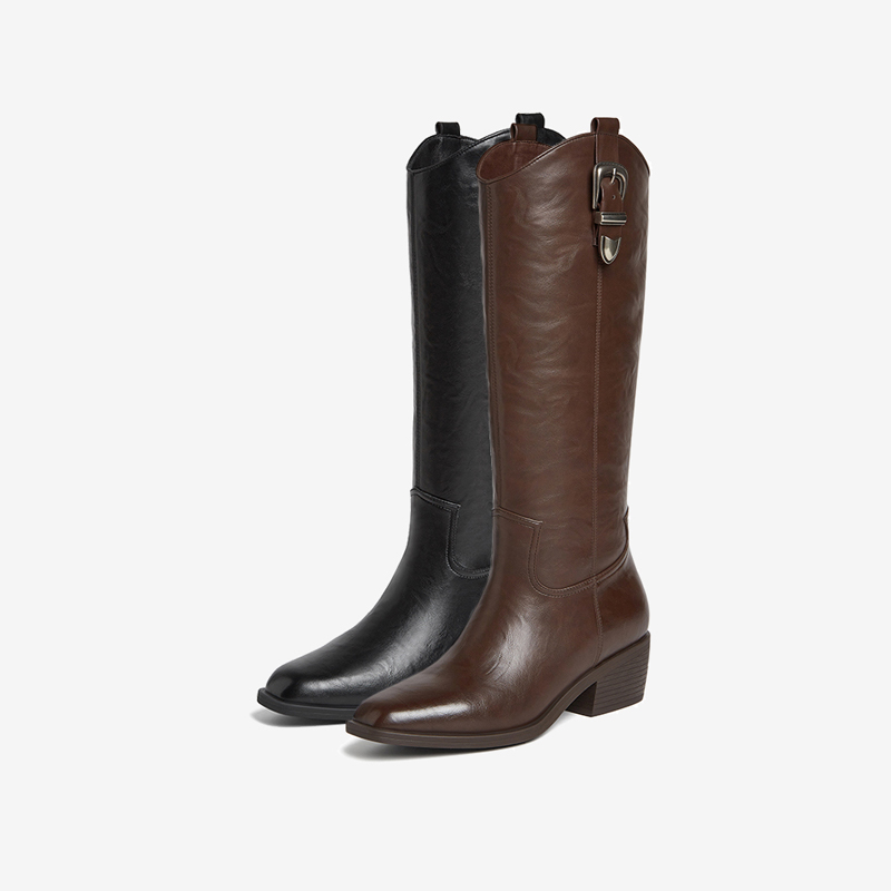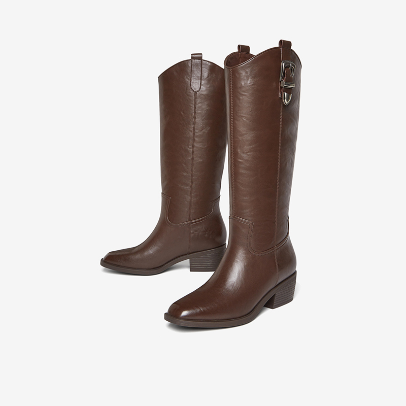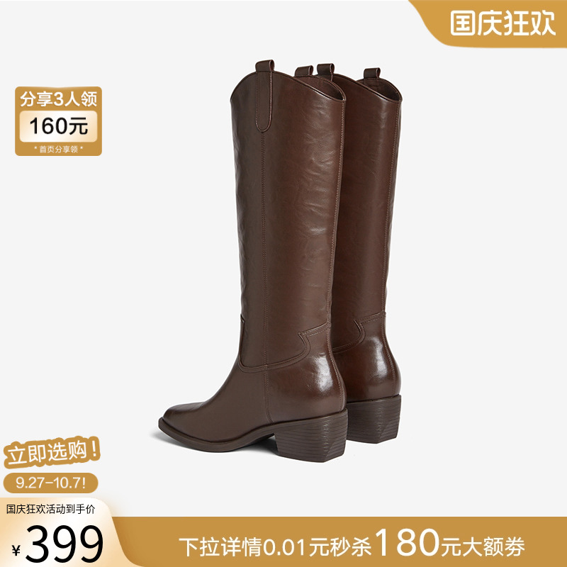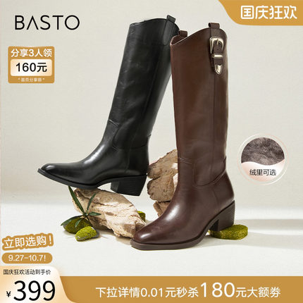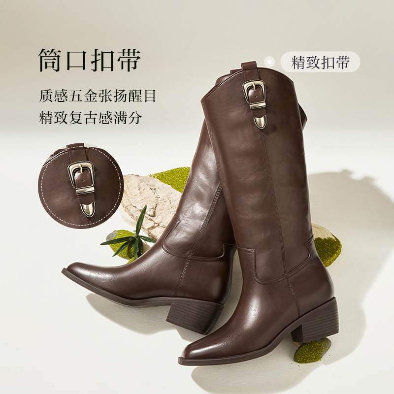百思图冬新款加绒V口显瘦骑士靴粗跟女尖头棕色长靴A5063DG4