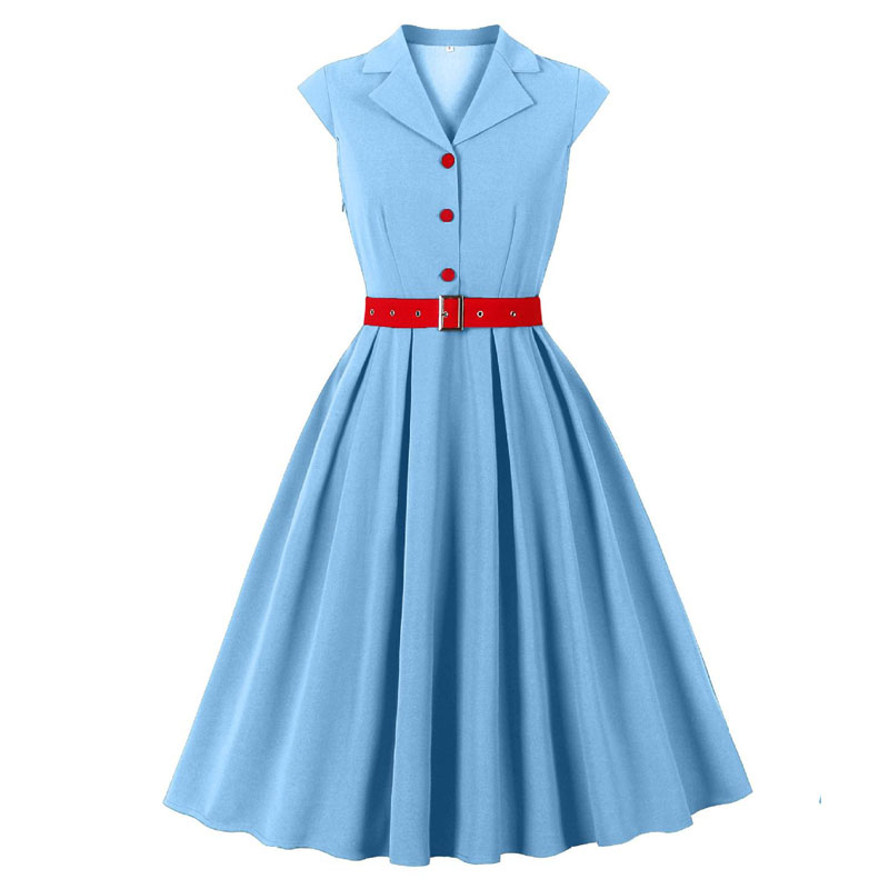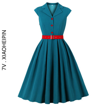 法式赫本风气质西装领收腰大摆长裙复古轻奢纯色夏季女无袖连衣裙