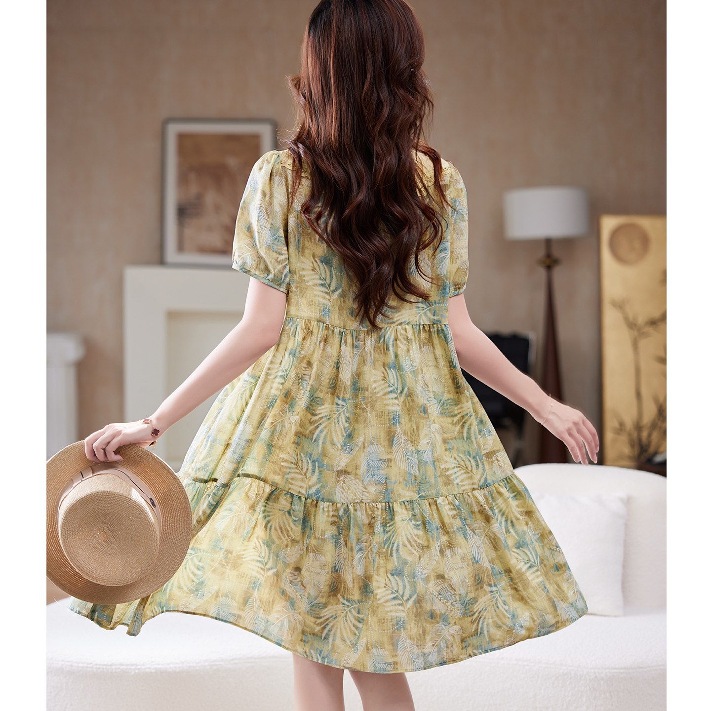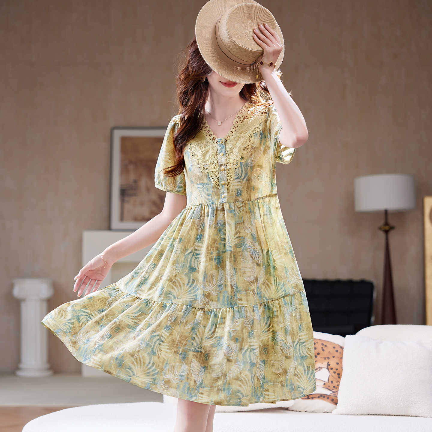 宝诗黎蕾丝拼接印花短袖连衣裙2025夏季韩系气质宽松A字雪纺裙潮