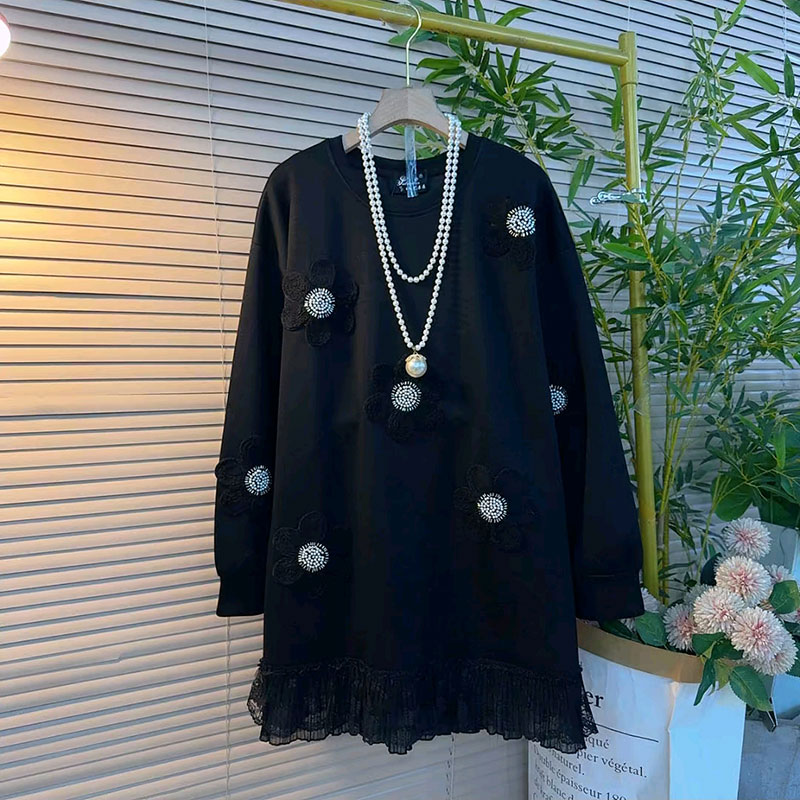 中长款设计感纯色大码女装秋季上衣立体花朵订钻拼接蕾丝花边大衫