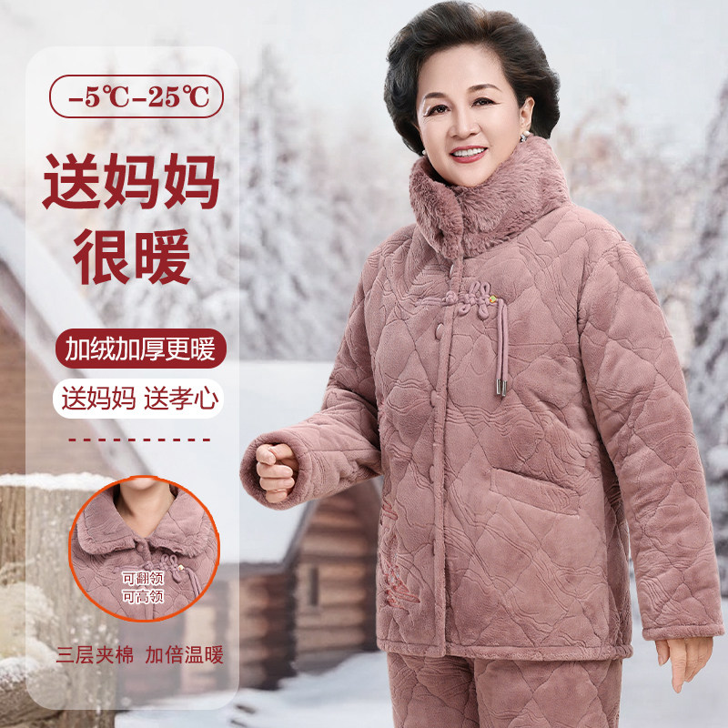 冬季棉服中老年大码夹棉睡衣女珊瑚绒保暖加厚加绒妈妈奶奶家居服