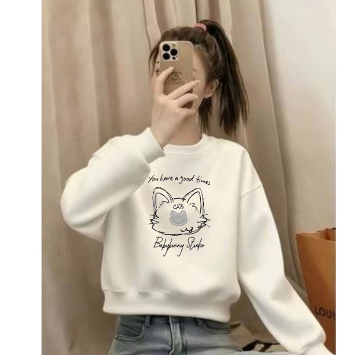杏色印花猫咪短款卫衣女保暖秋冬季宽松圆领小个子加绒加厚上衣潮