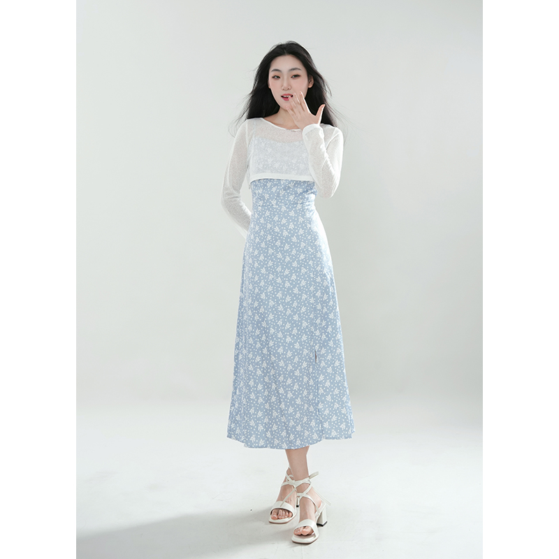 蓝色碎花吊带连衣裙女夏装2025年新款收腰显瘦气质长裙开衫套装女