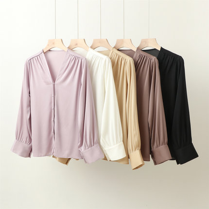通勤好物真丝衬衫女长袖v领桑蚕丝上衣春秋新款纯色百搭宽松显瘦