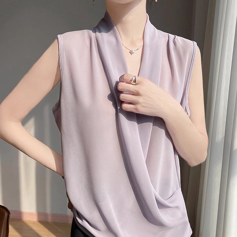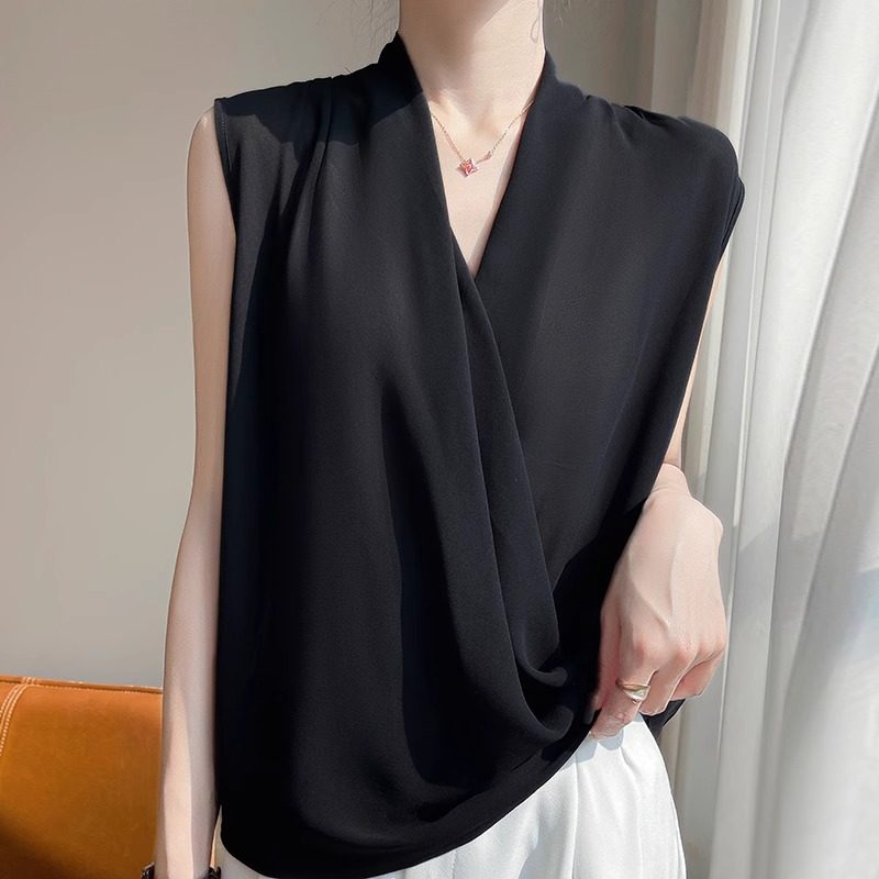 设计师高定~法式无袖t恤V领吊带背心女西装内搭雪纺交叉衬衫上衣