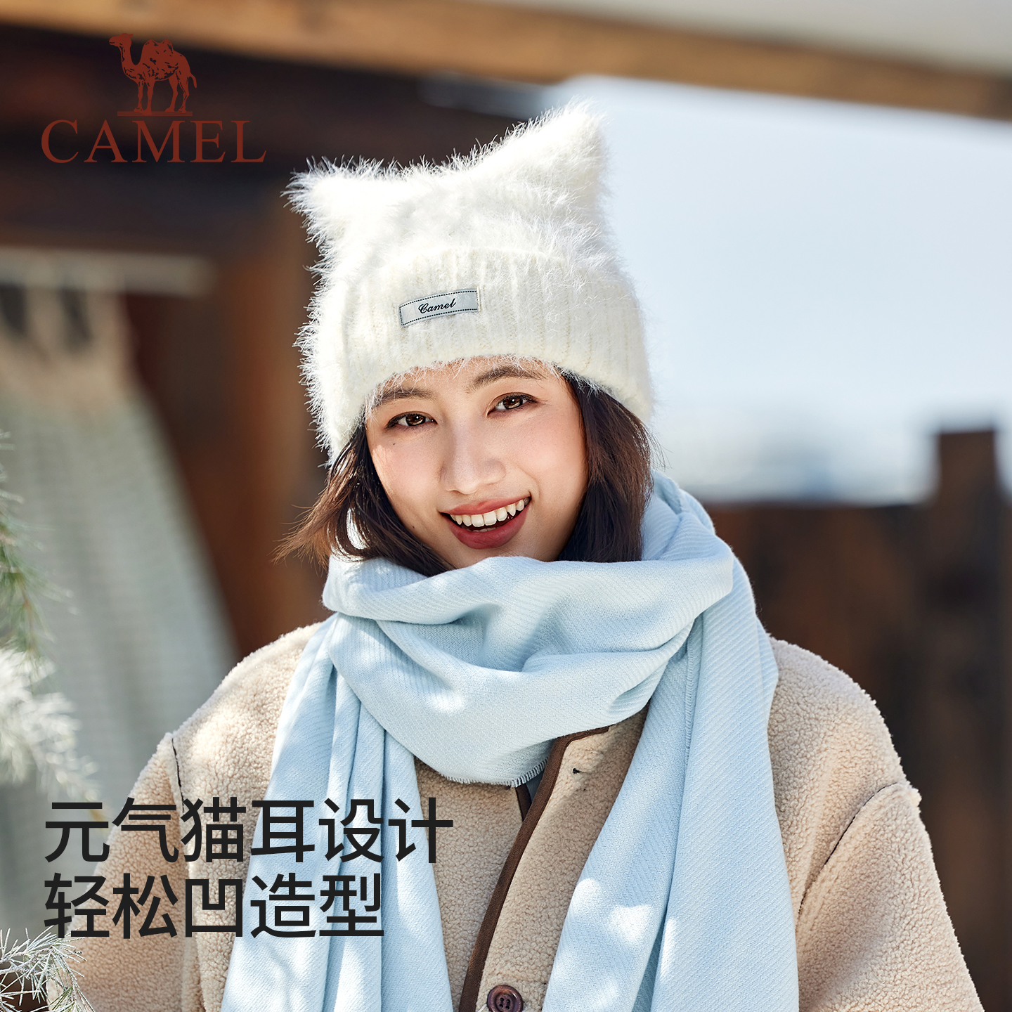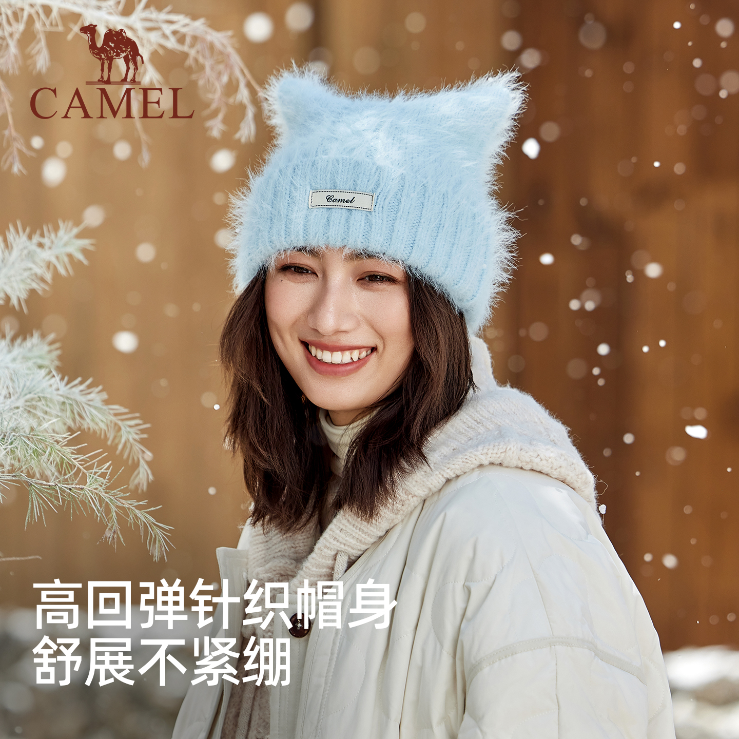 骆驼猫耳帽针织2025年新款秋冬季女可爱毛绒纯色冷帽保暖毛线帽子