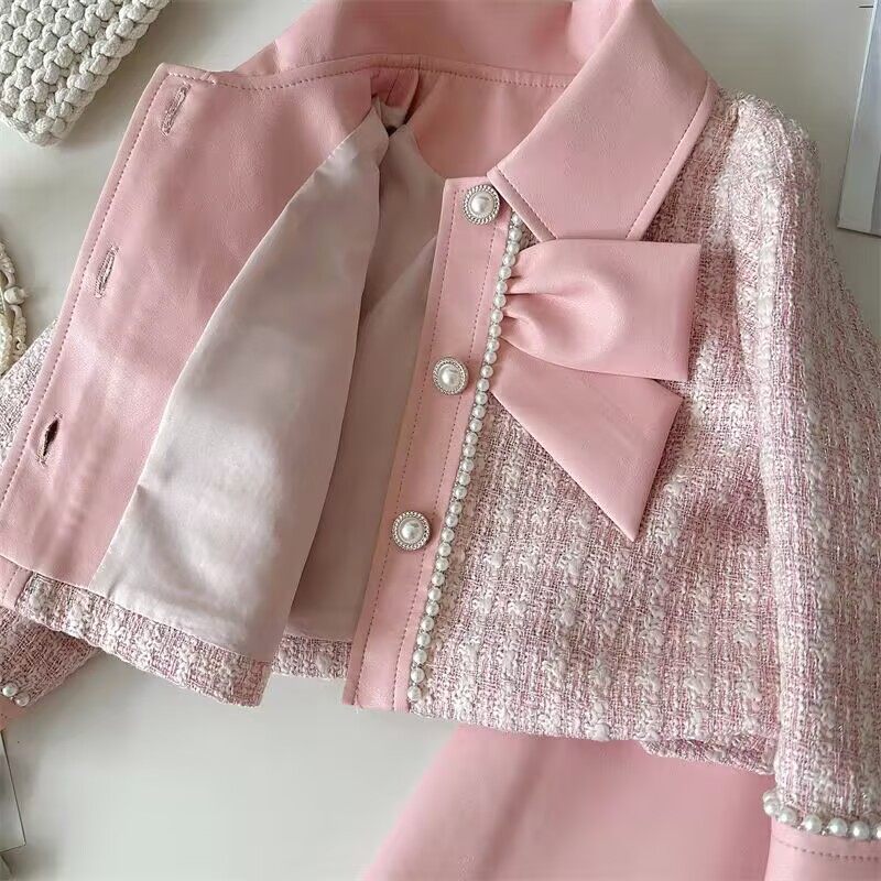 女童小香风韩版洋气两件套2024春秋季新款时尚名媛外套皮裙子套装