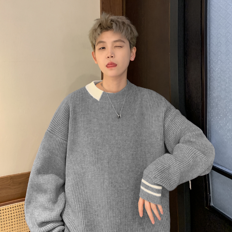 美式复古棕色情侣针织衫男秋宽松慵懒风纯色毛衣潮牌圆领打底线衣