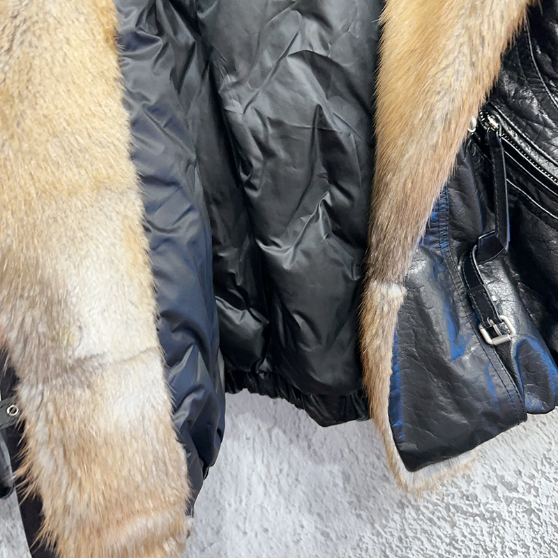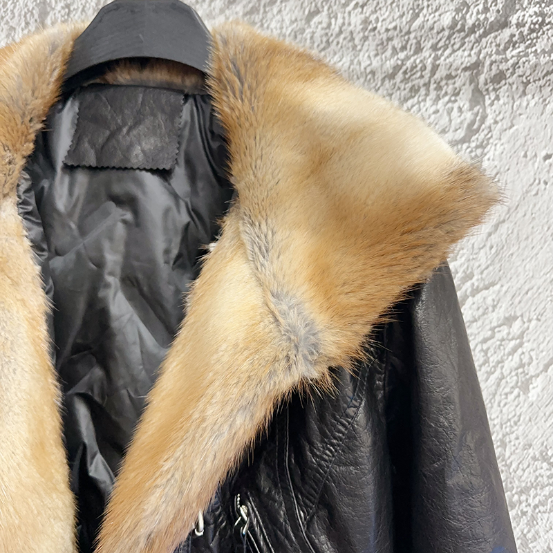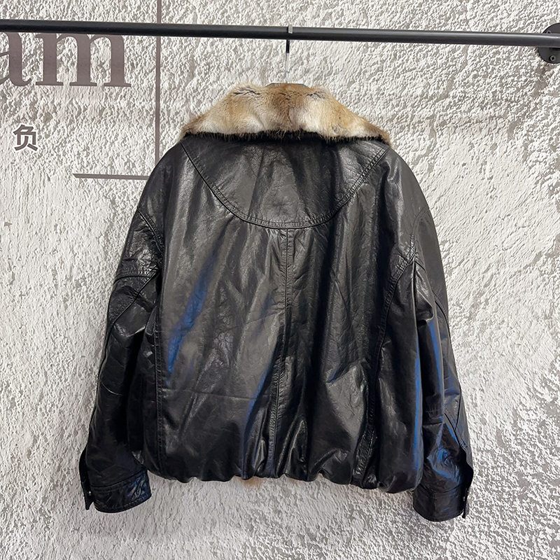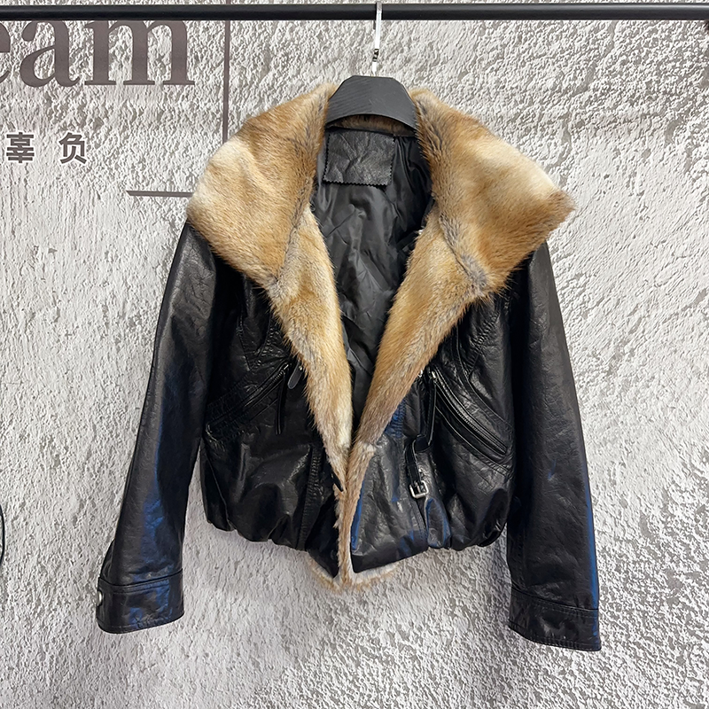 真皮皮衣牛皮油蜡青根貂新款皮衣女短款羽绒服宽松夹克外套上衣