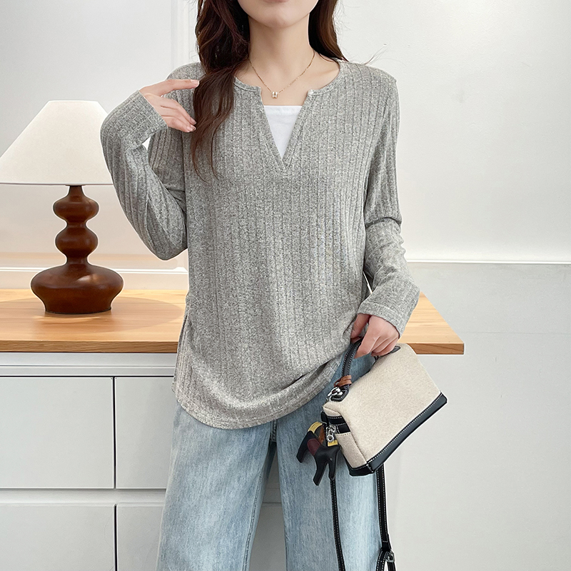 大码女装假两件针织正肩长袖t恤春秋新款胖mm显瘦内搭打底衫上衣
