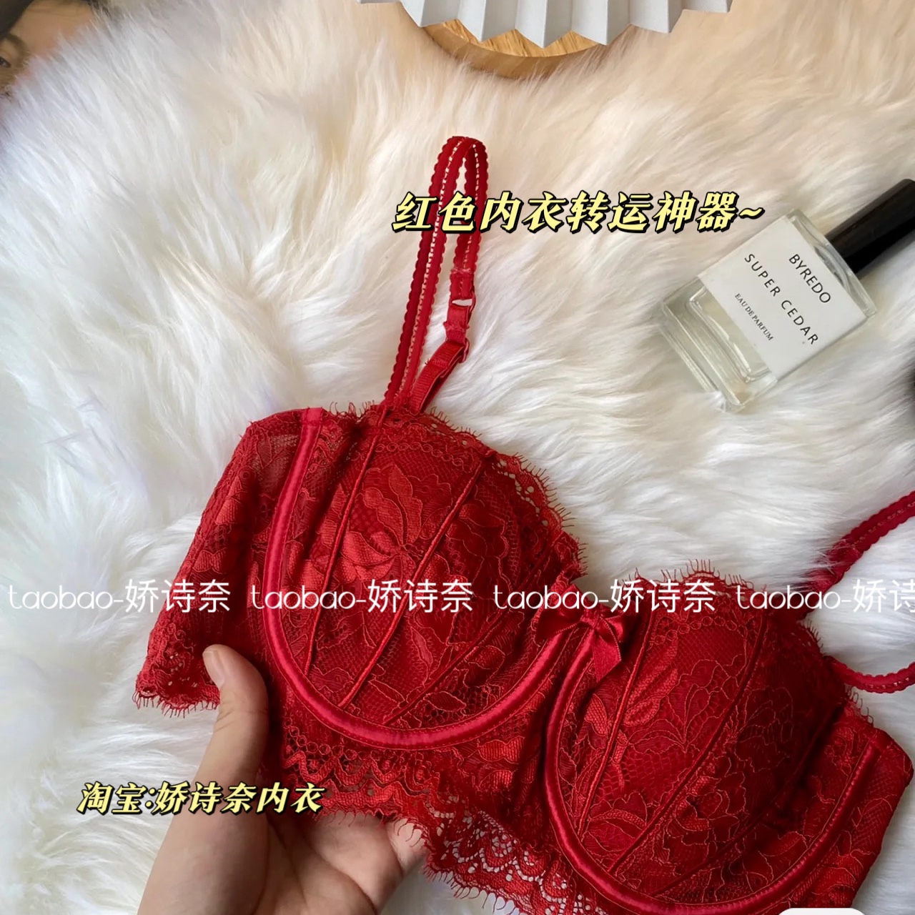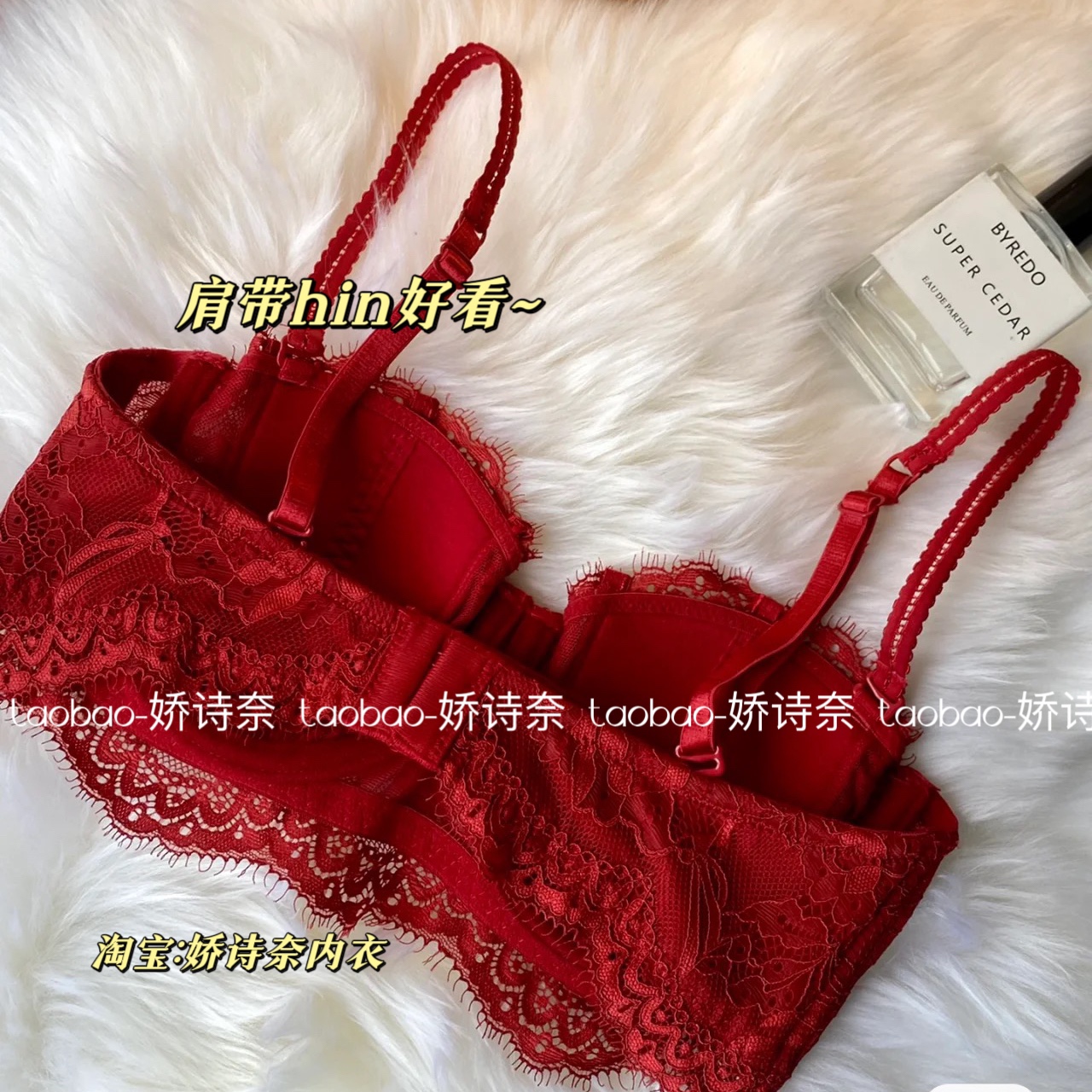 龙年本命年内衣套装女薄款大胸显小收副乳防下垂结婚新娘红色文胸