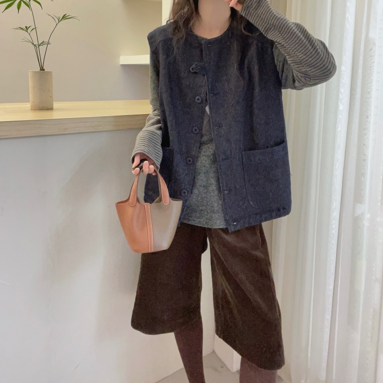 欧洲站2025秋冬新款欧货双口袋单排扣深色牛仔夹棉叠穿背心马甲女
