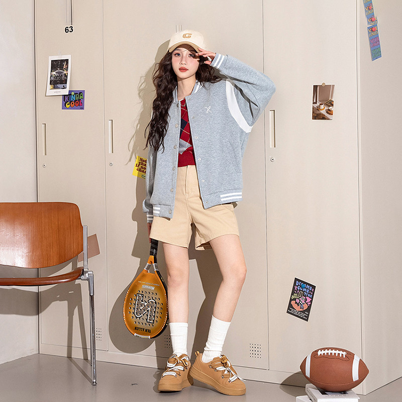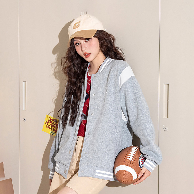 热风女士棒球服外套25秋学院风休闲减龄简约刺绣百搭开衫外套