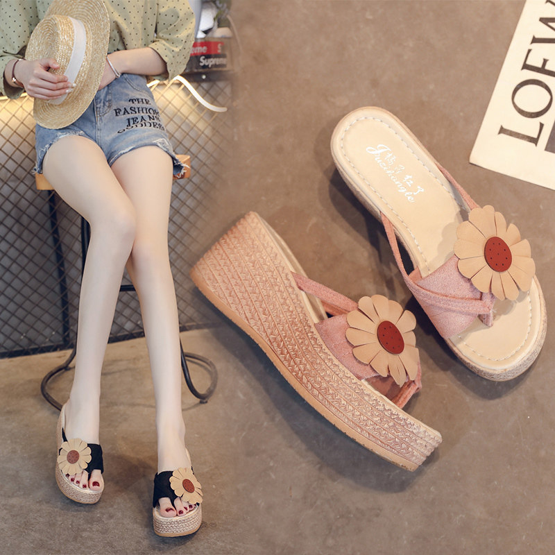 2022夏季新款高跟坡跟花朵女凉拖外穿女拖鞋时尚人字拖度假女凉鞋