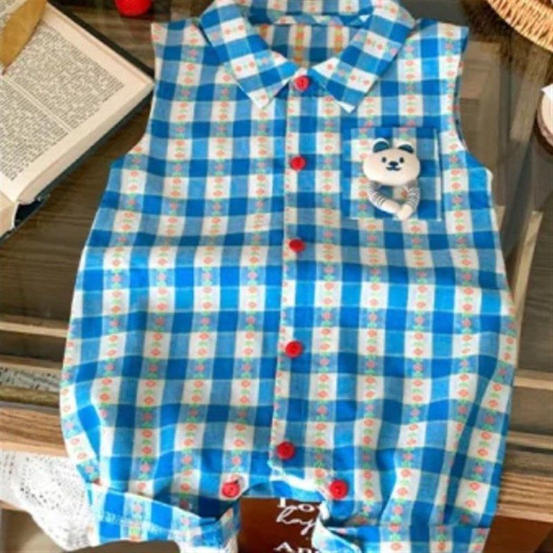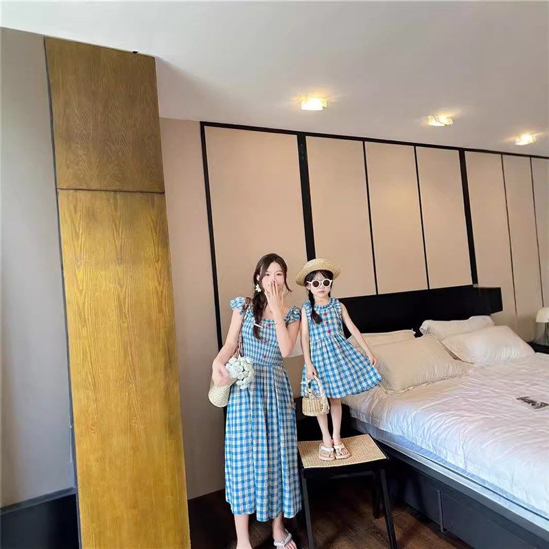 高级感蓝色浪漫气质格子母女花边连衣裙夏季亲子装气质度假风裙