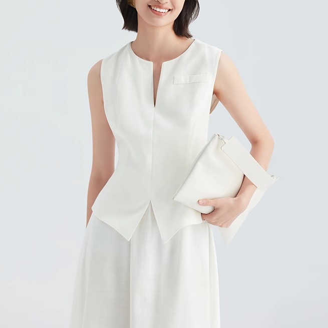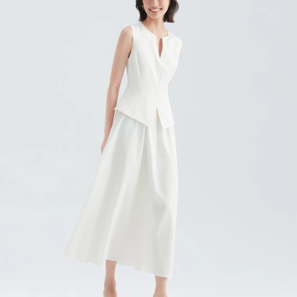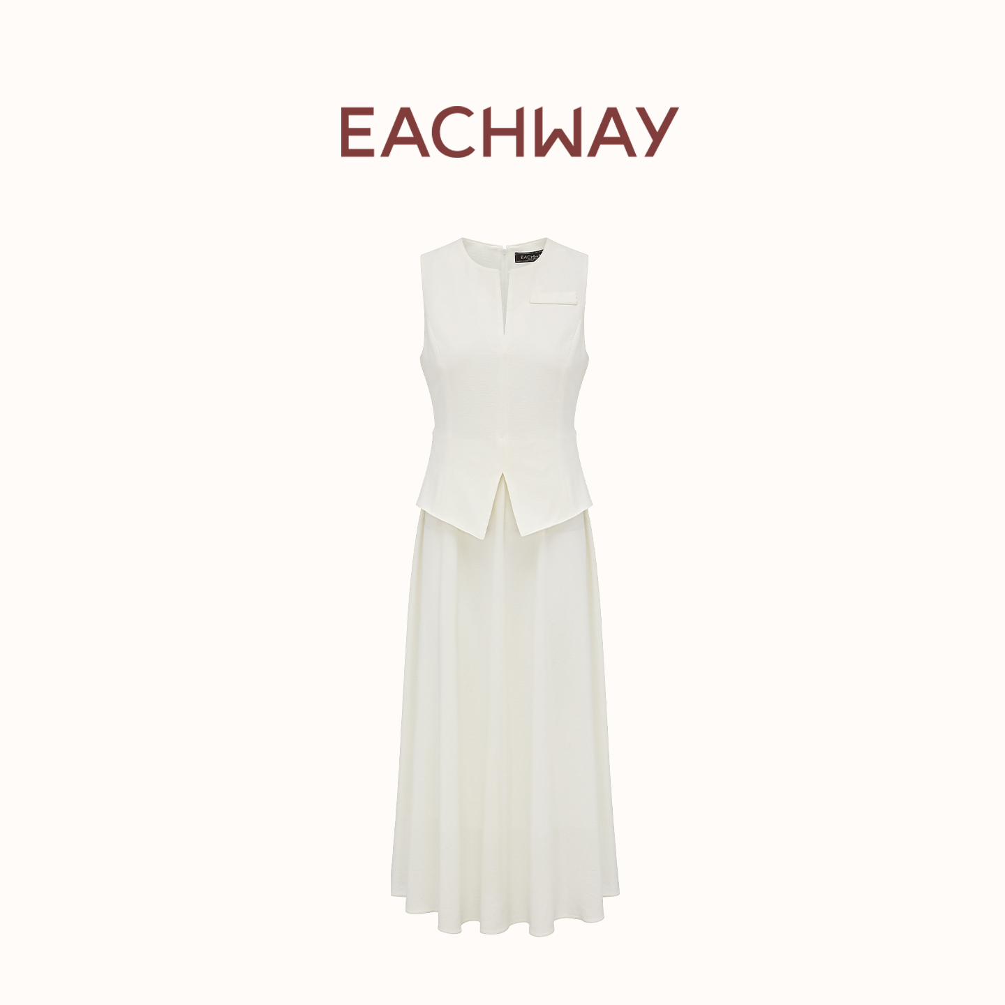 艺之卉假两件式时尚小V领轻职场中长白色连衣裙2025秋新款