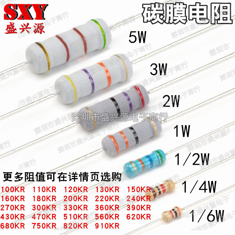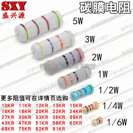1/6W1/4W1/2W1W2W3W5W5%碳膜电阻10K15K20K27K30K36K47K51K75K91K